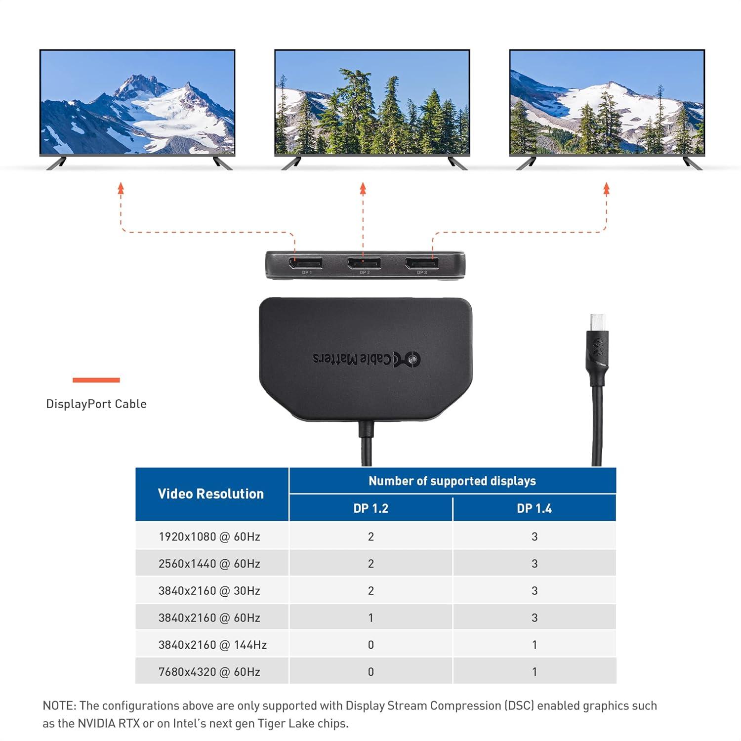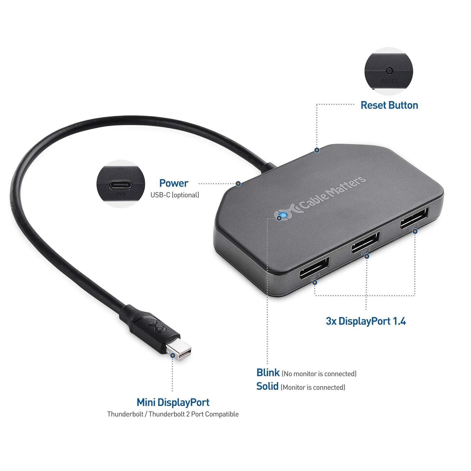 Cable Matters 101075, Triple Monitor Mini DisplayPort/DisplayPort Hub, (3X 4K Display Port Splitter) 3-Port DP 1.4 Enabled for 8K and 4K 120Hz HDR for Windows Only, NOT Compatible with macOS