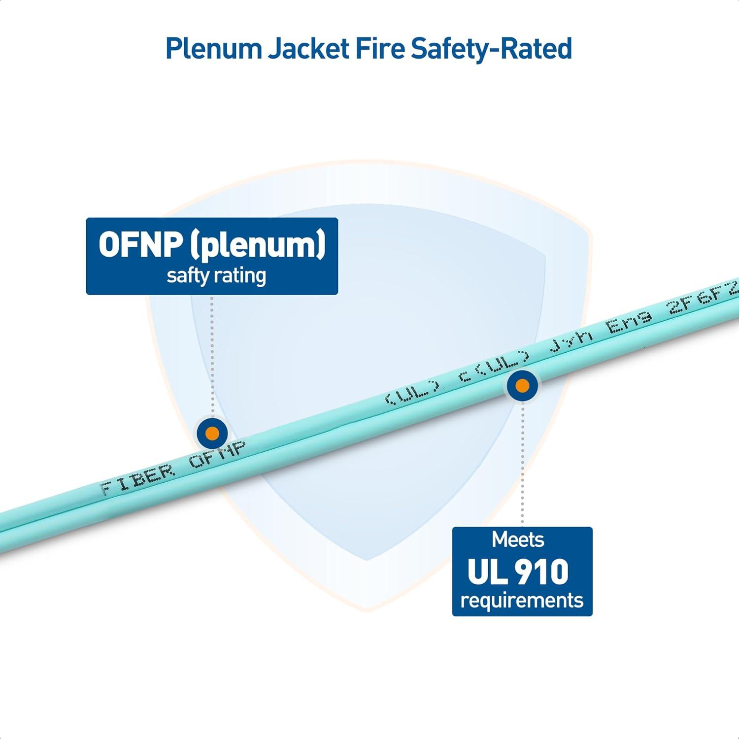 Standards compliant OM3 cable includes a superior OFNP (plenum) safty rating that substitutes for OFNR (riser) rated cable; TIA/EIA compliant color-coded aqua jacket has beige connectors and straight-thru A to B wiring; OM3 classification rating operates with Gigabit Ethernet 1000Base-LX, 1000Base-SX, or 10GBase-S/LR4/LRM, and Fibre Channel 100/200/400/1200-MX; Backwards compatible with FDDI, and Fast Ethernet 10/100BASE SX or FX
