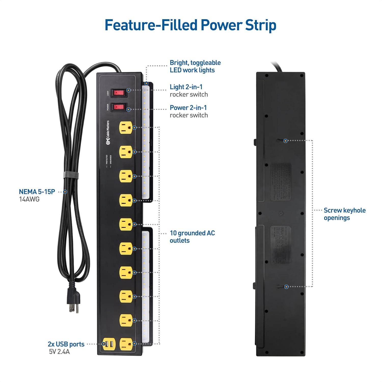 Outlet strip turns 1 grounded outlet into 10 grounded outlets plus 2 USB ports; Connect with confidence with this industrial power strip