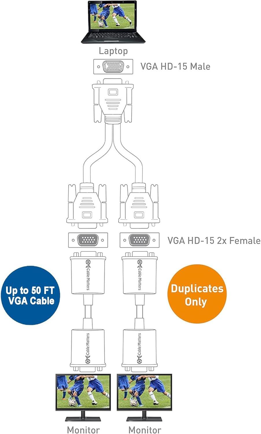 VGA Dual Monitor Adapter: This VGA splitter cable duplicates a single VGA signal to two VGA displays, sending the same image to both monitors (VGA cables sold separately). Note: This VGA splitter only mirrors the display and does not support extended or independent screens.