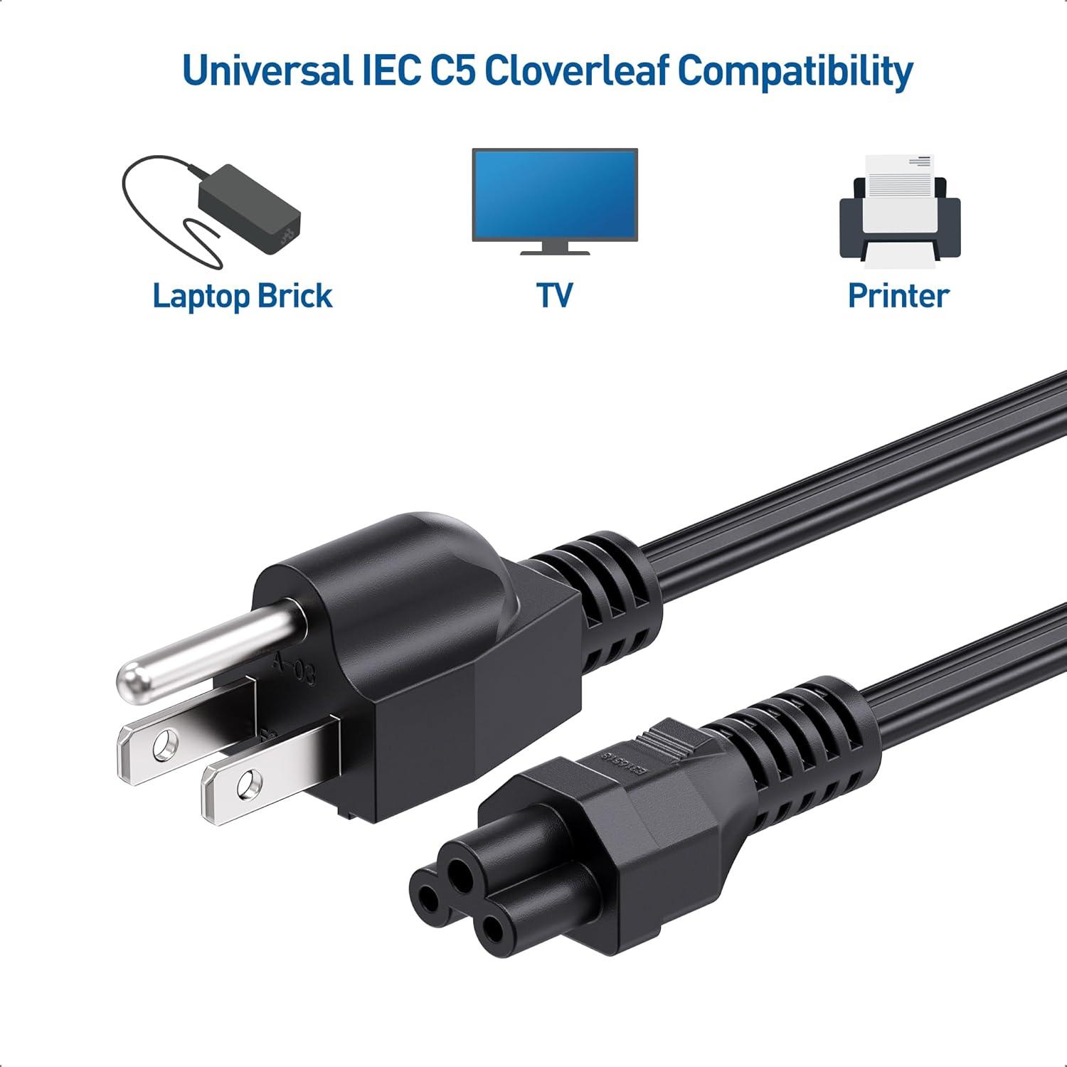 Three prong power cord replaces a misplaced or short factory laptop power cord; HP power cord with an IEC 60320 C5 receptacle connects a laptop to a standard 3 pronged 120V AC outlet; Connect a laptop power transformer brick with a C6 cloverleaf male port; Also referred to as Mickey mouse cable or 3 prong replacement cord