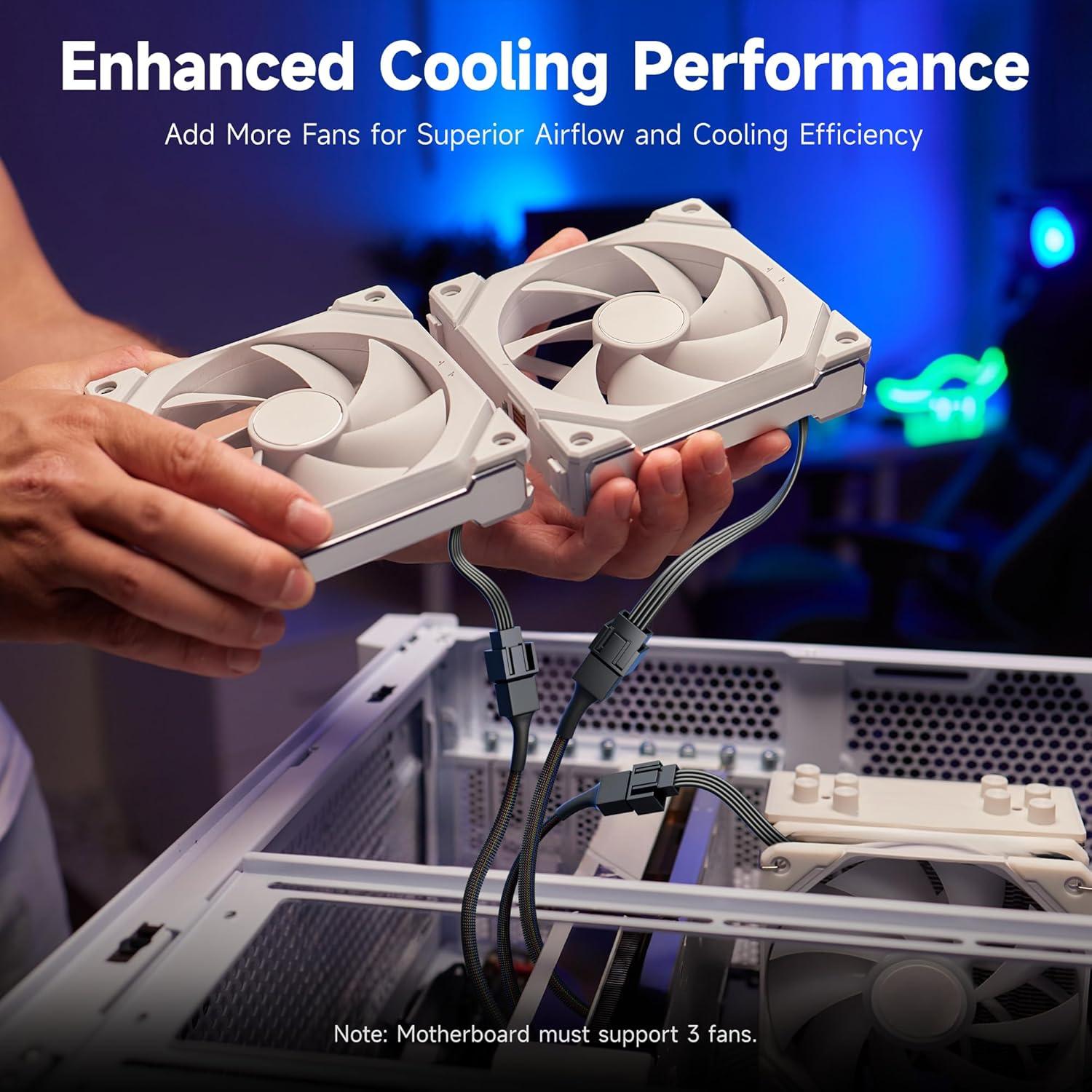 Triple Fan Connection Solution: 4 pin fan splitter cable connects 3 computer case fans to a single motherboard fan header; PWM splitter cable connects an additional fan to increase airflow in your computer case; Fan speed label on the 4 pin fan master connector of the fan header splitter is wired to receive the PWM control signal and share it to the slave fans.