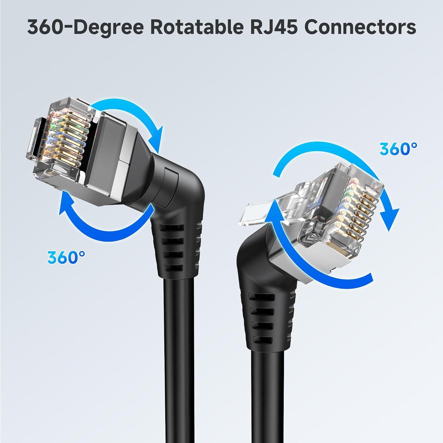 360-Degree Rotatable RJ45 Connectors: Equipped with 360-degree rotatable RJ45 connectors on both ends, this Ethernet cable offers versatile and flexible installation in tight spaces. Perfect for managing connections in crowded setups where standard cables struggle.
