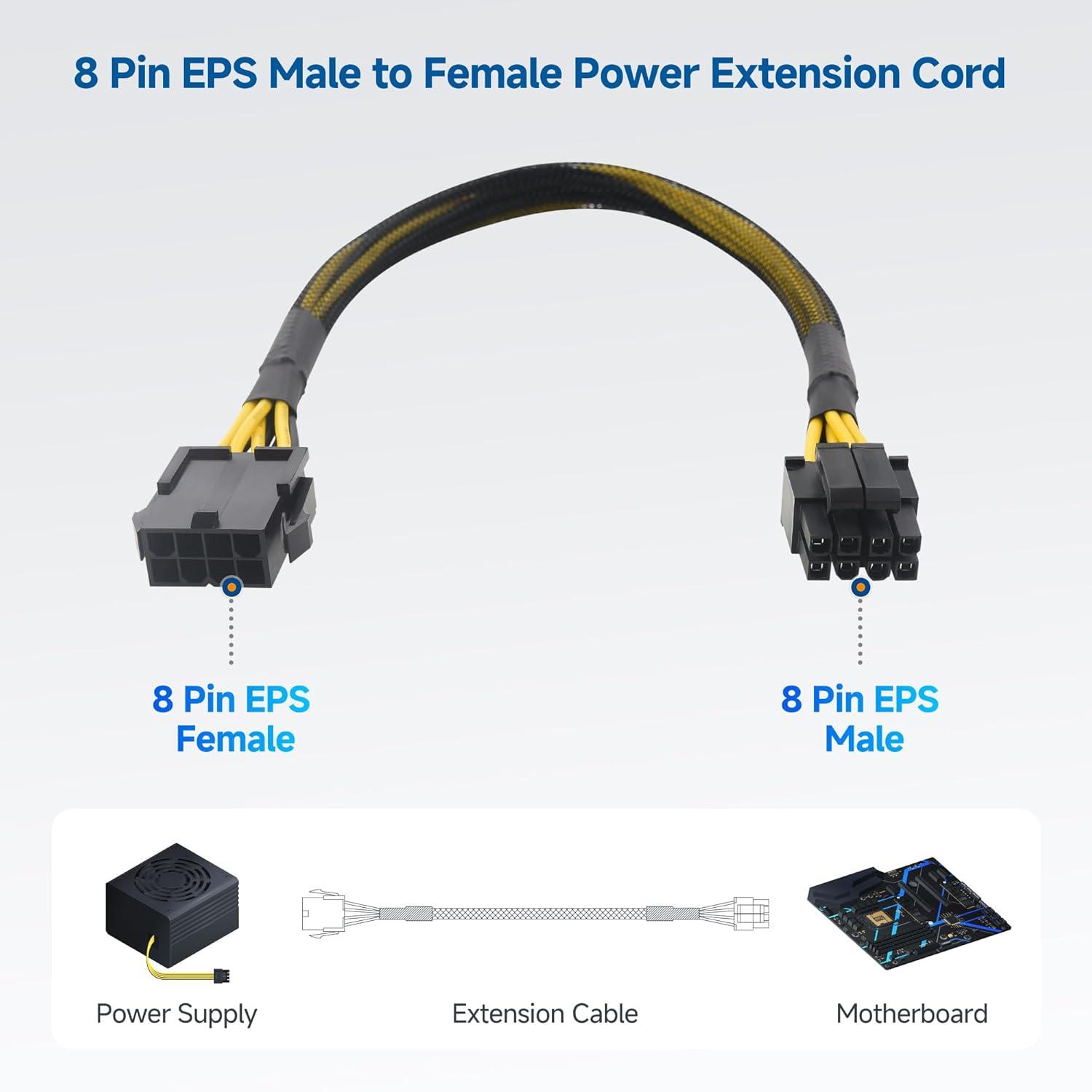 CPU Power Extension: This 8 pin EPS extension cable provides additional length to connect the motherboard CPU power connector without stretching or stressing the PSU cables, ideal for larger PC cases or custom builds.