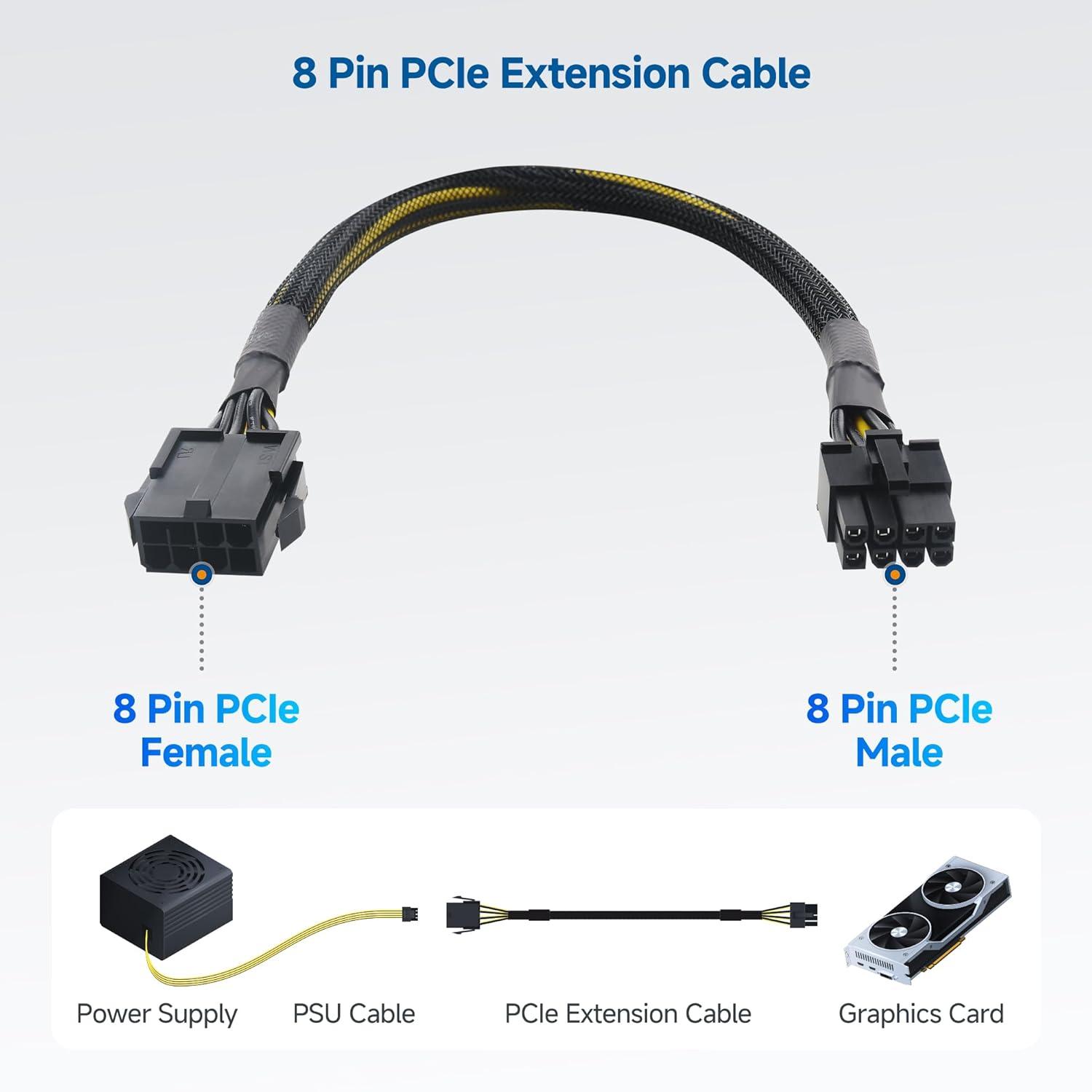 GPU Compatibility Enhancement: Extend the reach of your GPU power connection with this Male-to-Female 8-pin PCIe extension cable. Perfect for larger PC cases, it helps you connect your graphics card without stretching or stressing your PSU cables. Note: Not for CPU power, modular PSUs, or male-to-male connections. For GPU PCIe extension only.