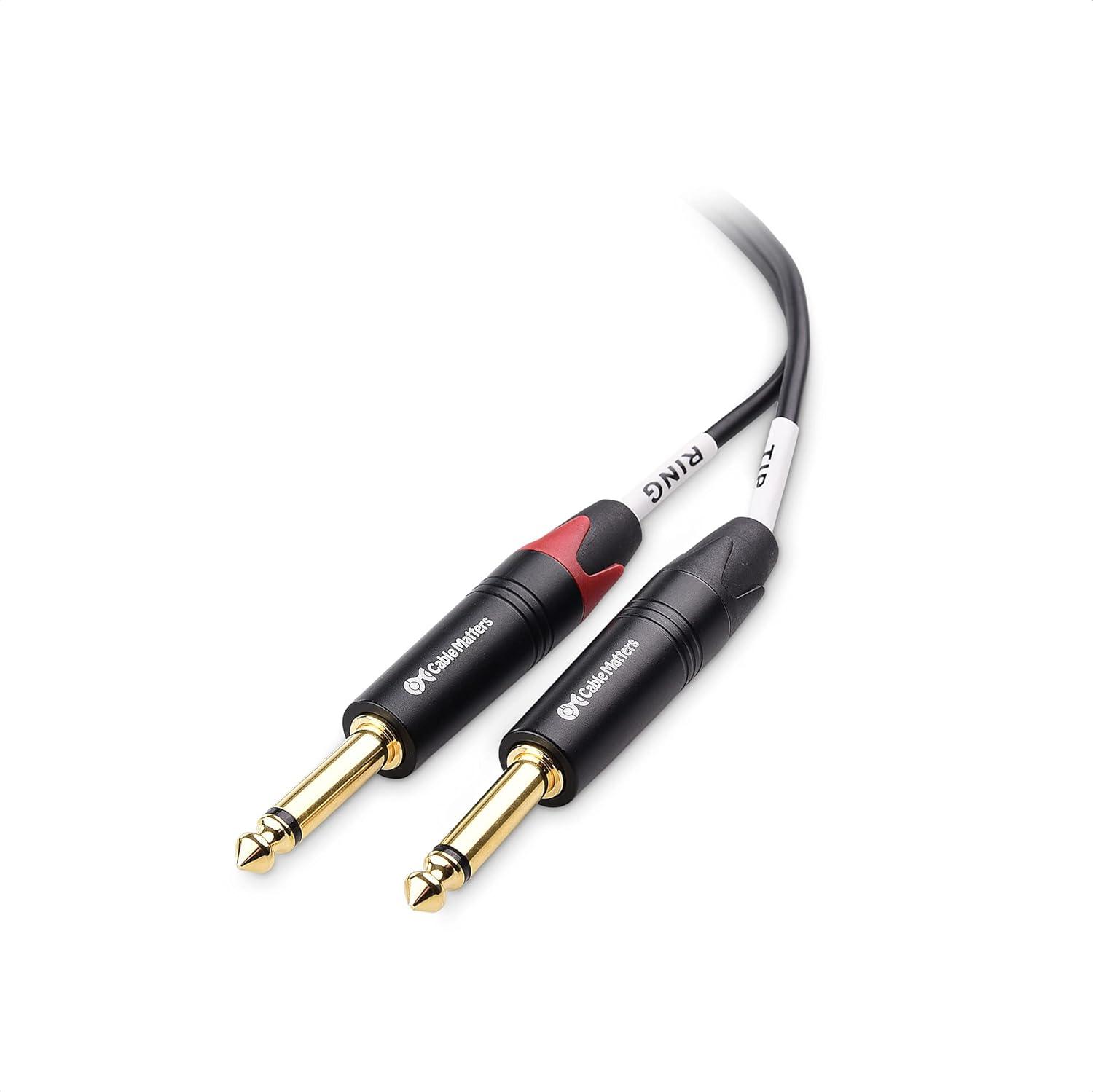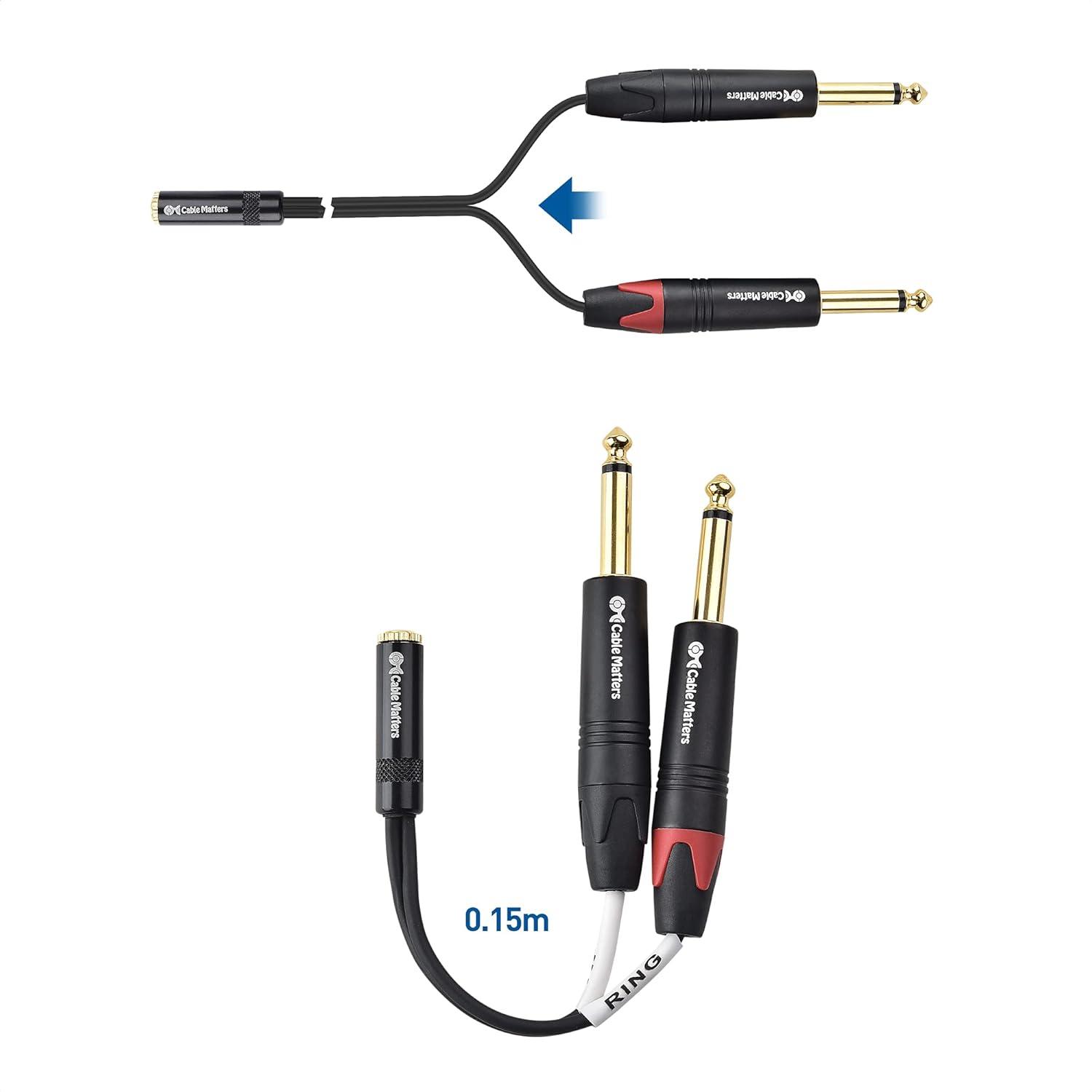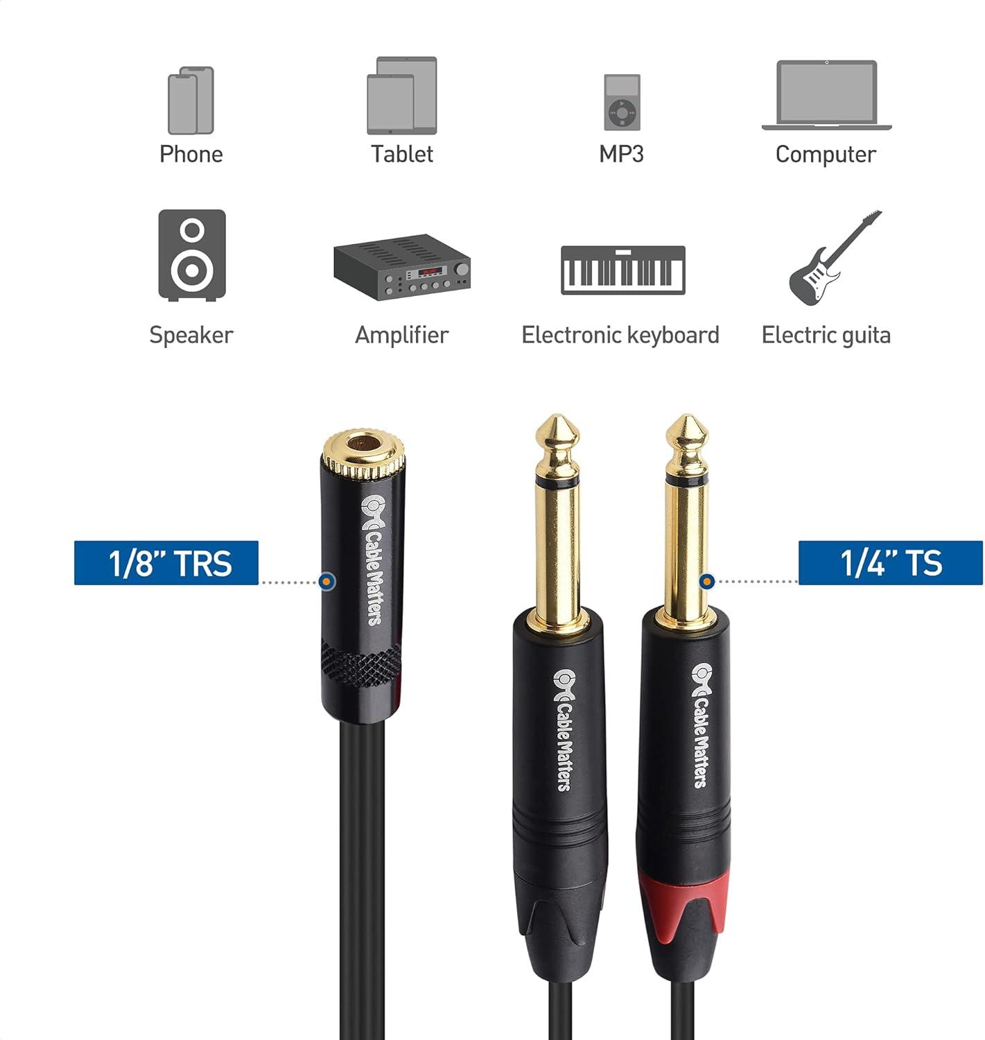 Connect pro audio gear with the Cable Matters 3.5mm to 1/4 splitter dual connector; dual 1/4 male to 3.5mm female cable connects a device over 3.5mm to equipment with one or two 1/4 connectors
