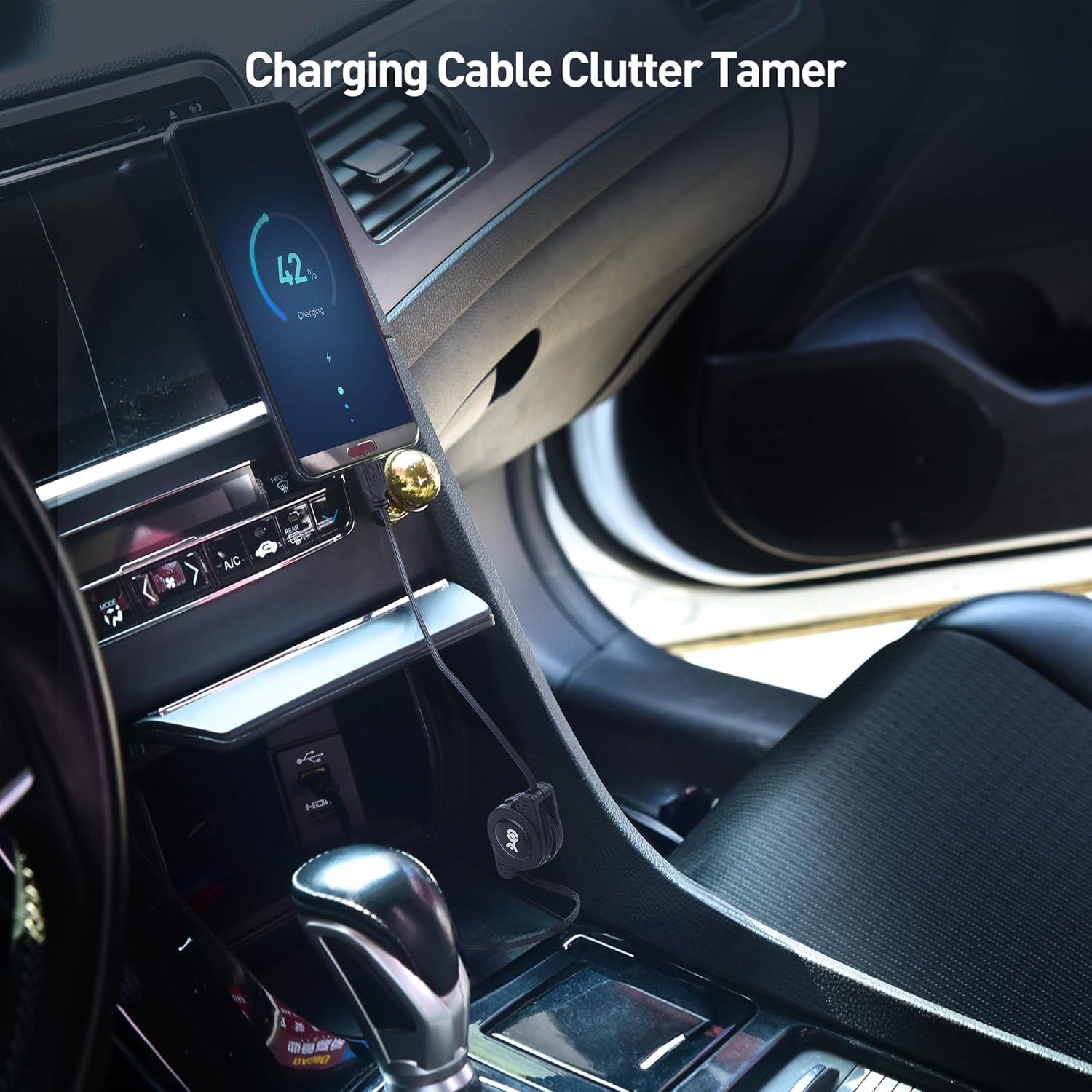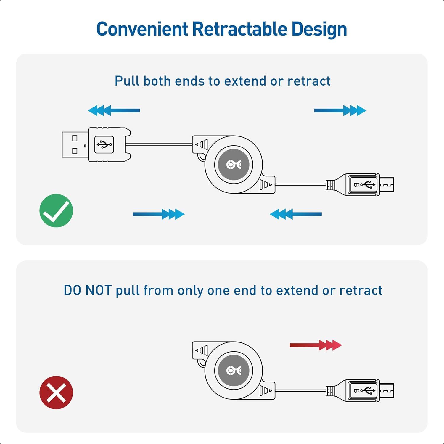 Tangle-free retractable charger cable adjusts to the perfect length; Simply pull on both ends of the retractable USB cable to unwind to the ideal length and then pull the ends again to rewind; Fully retractable from 33 inches to 2 inches for storage in a glove compartment or desk drawer