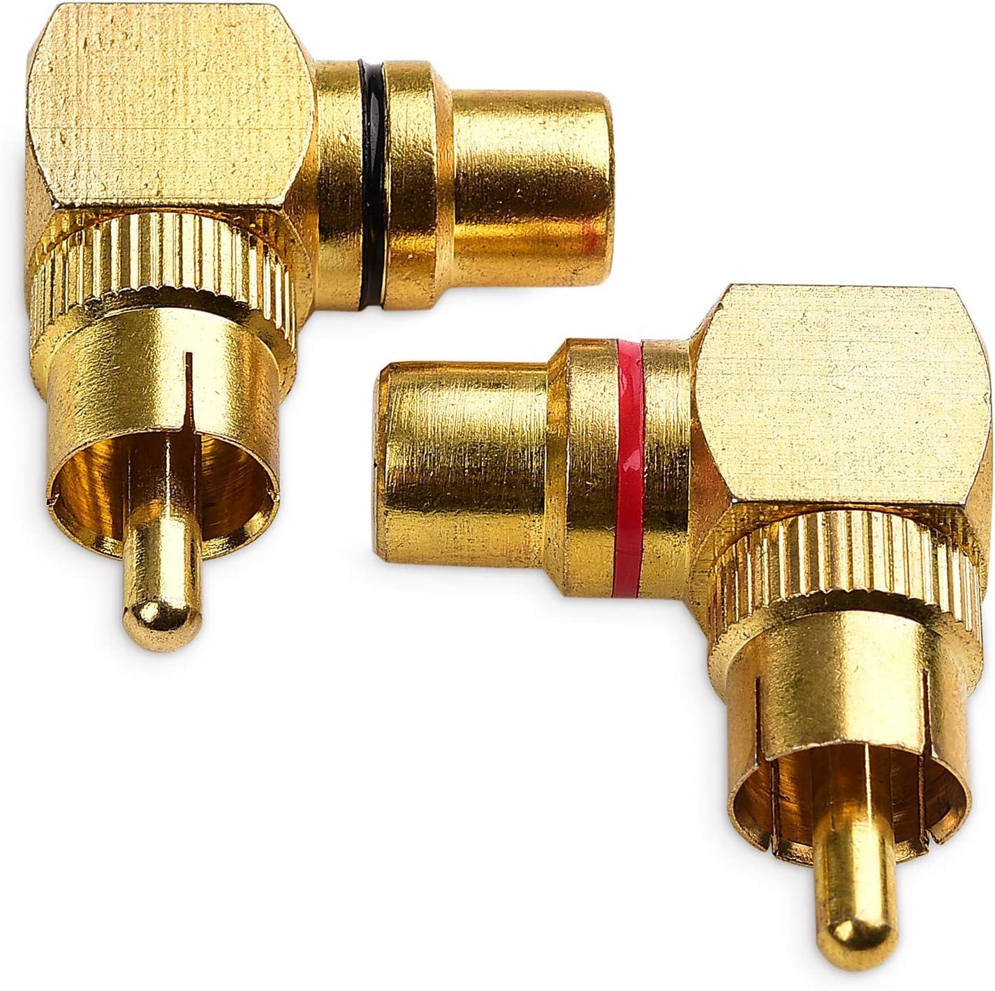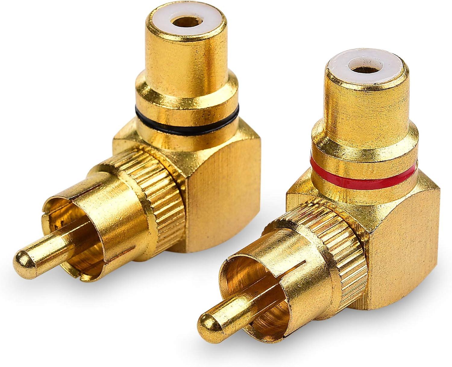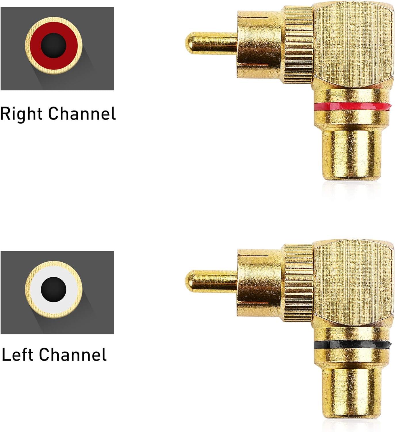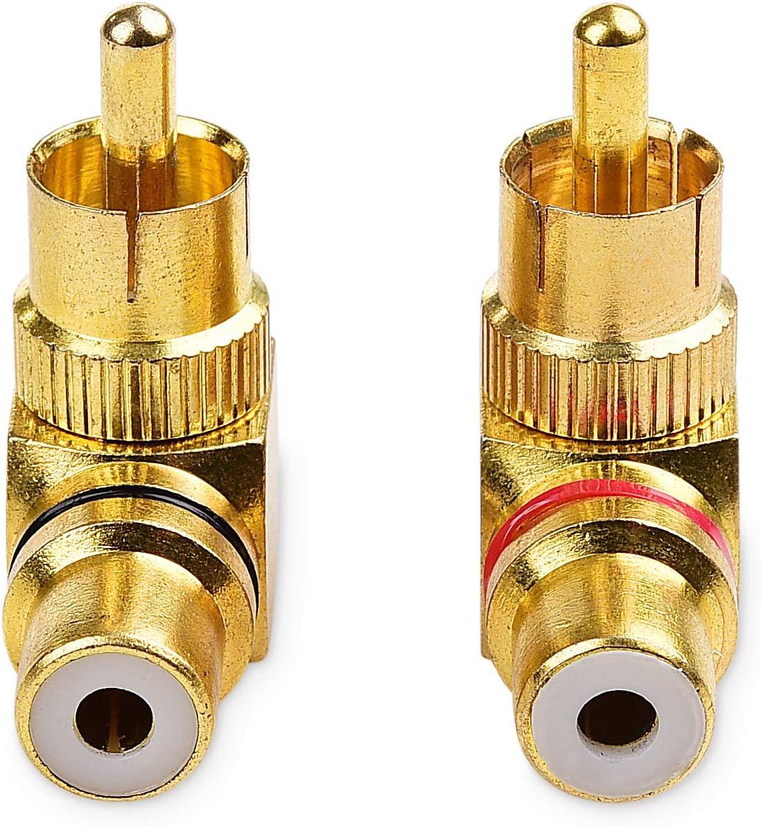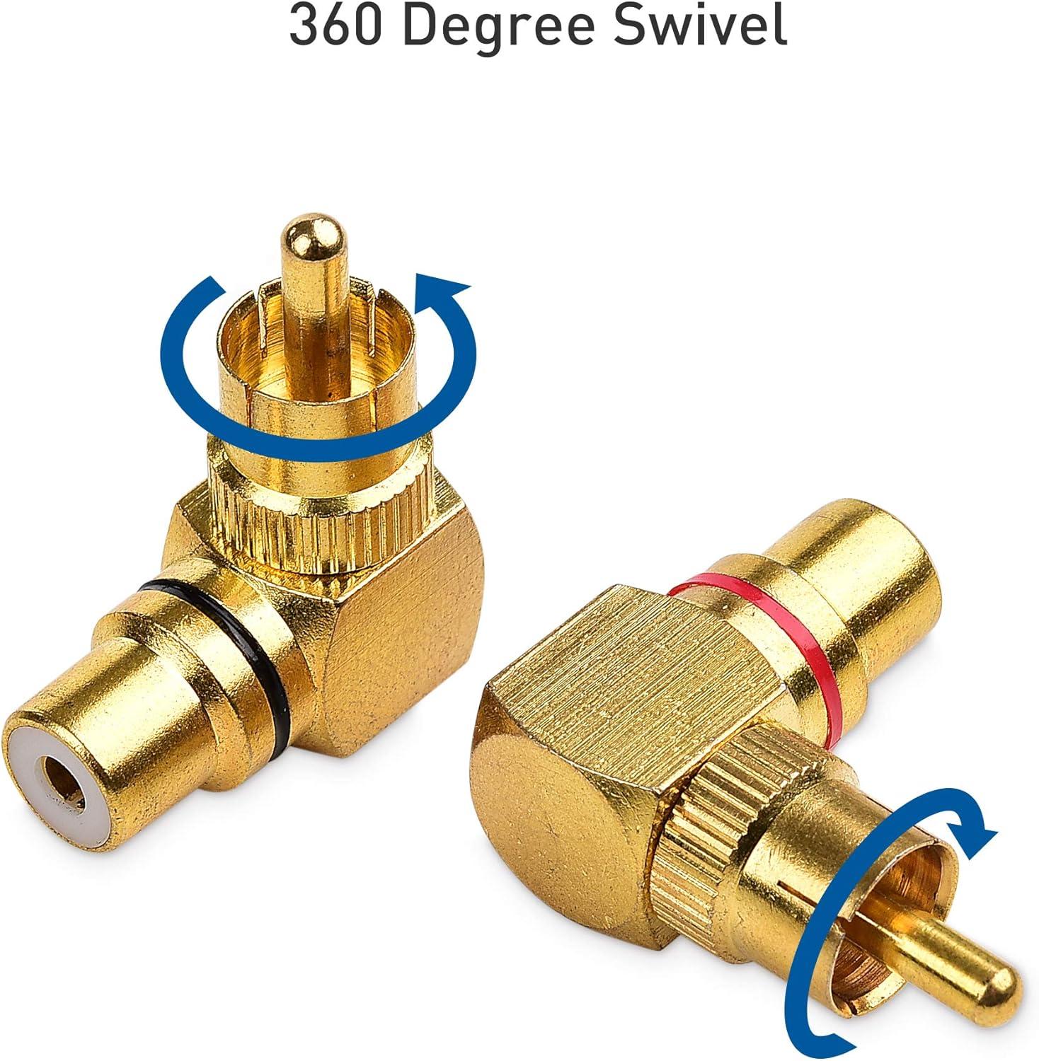 Right angle RCA adapter connects to the RCA white and red channel portsfound on video and audio electronic equipment; Adjustable RCA phono cable connector can be rotated to route the cable at the best possible angle from your AV receiver