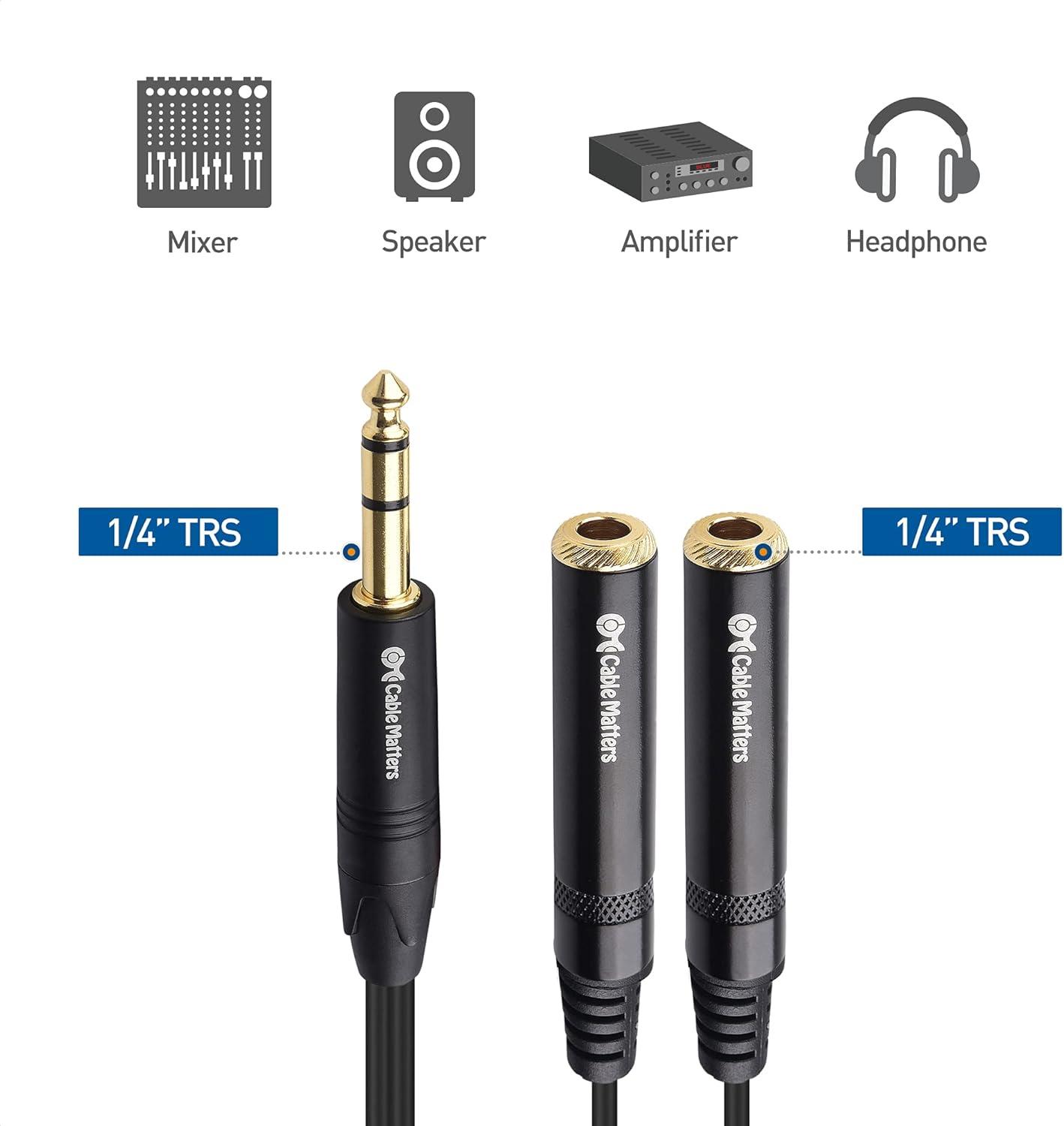 1/4 to dual 1/4 TRS adapter is compatible with 1/4 inch audio equipment and 1/4 TRS audio jacks commonly found on pro level headphones and audio equipment; Use the 1/4 audio cable to dual TRS adapter to duplicate a stereo signal into two for connecting multiple pairs of headphones to the same device