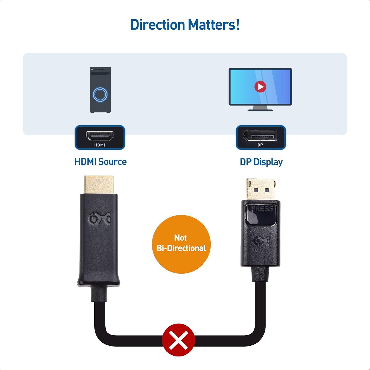 Convenient HDMI to DisplayPort cable (HDMI to DP cable) directly connects a DisplayPort (DP, DP++, DisplayPort++) equipped computer to an HDTV, monitor, or projector with HDMI input