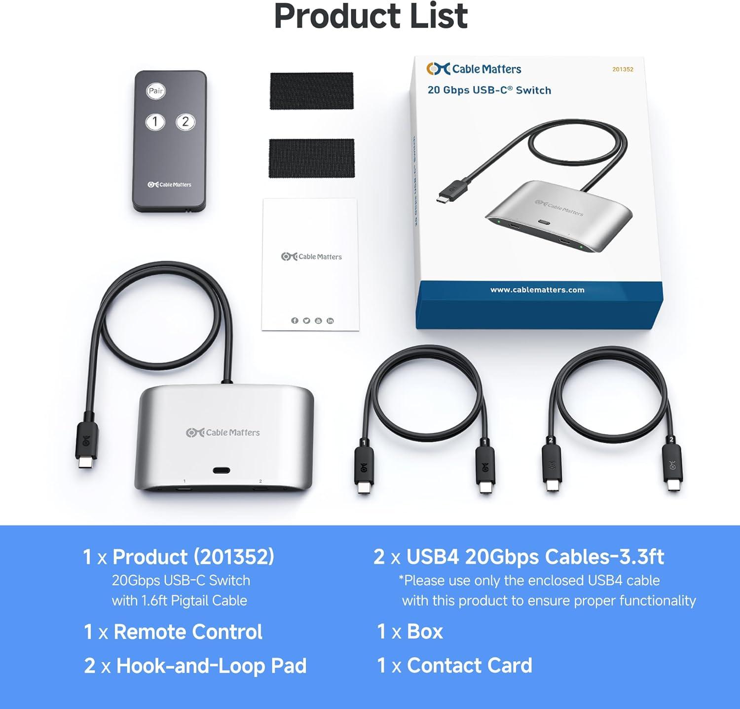 Compatibility Warning: Use only the included USB4 20Gbps cables. Do not substitute with Thunderbolt 3/4/5 cables. The switch works with USB4 and Thunderbolt 4 docks, but its 20 Gbps bandwidth (vs. 40 Gbps for most docks) may limit the number of displays or the maximum resolution/refresh rate compared to your original setup. Avoid USB-C docks with built-in pigtail cables to prevent compatibility issues.