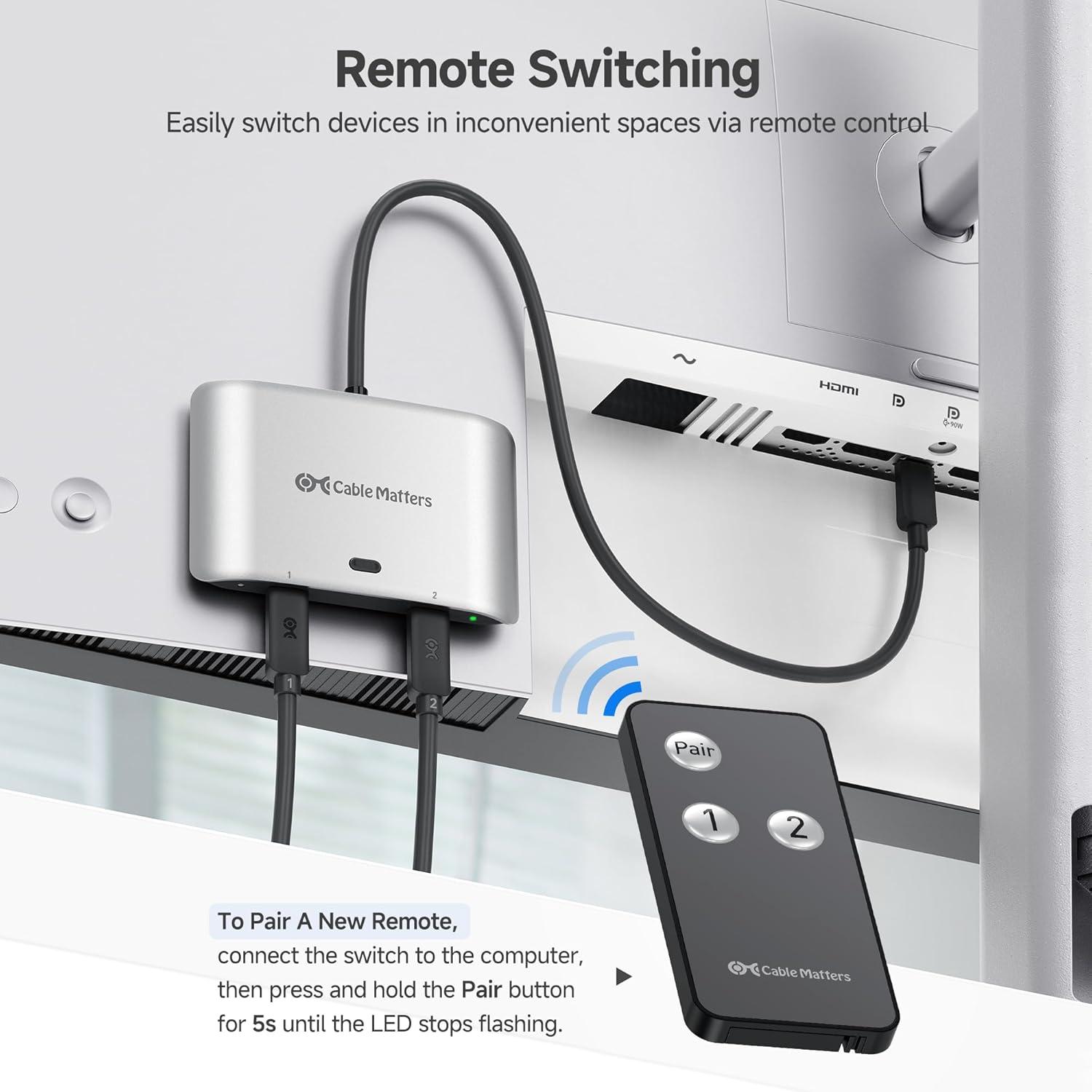 Convenient RF Remote Control: Functioning as a Thunderbolt 4 switch, it can seamlessly switch between two connected hosts using the included RF remote control, without the hassle of additional software or drivers. Maintain a clean and organized workspace by eliminating the need for extra cables and switches. This flexibility allows for optimal placement of the USB C switcher 2 computers, ensuring it fits perfectly within your workspace setup.