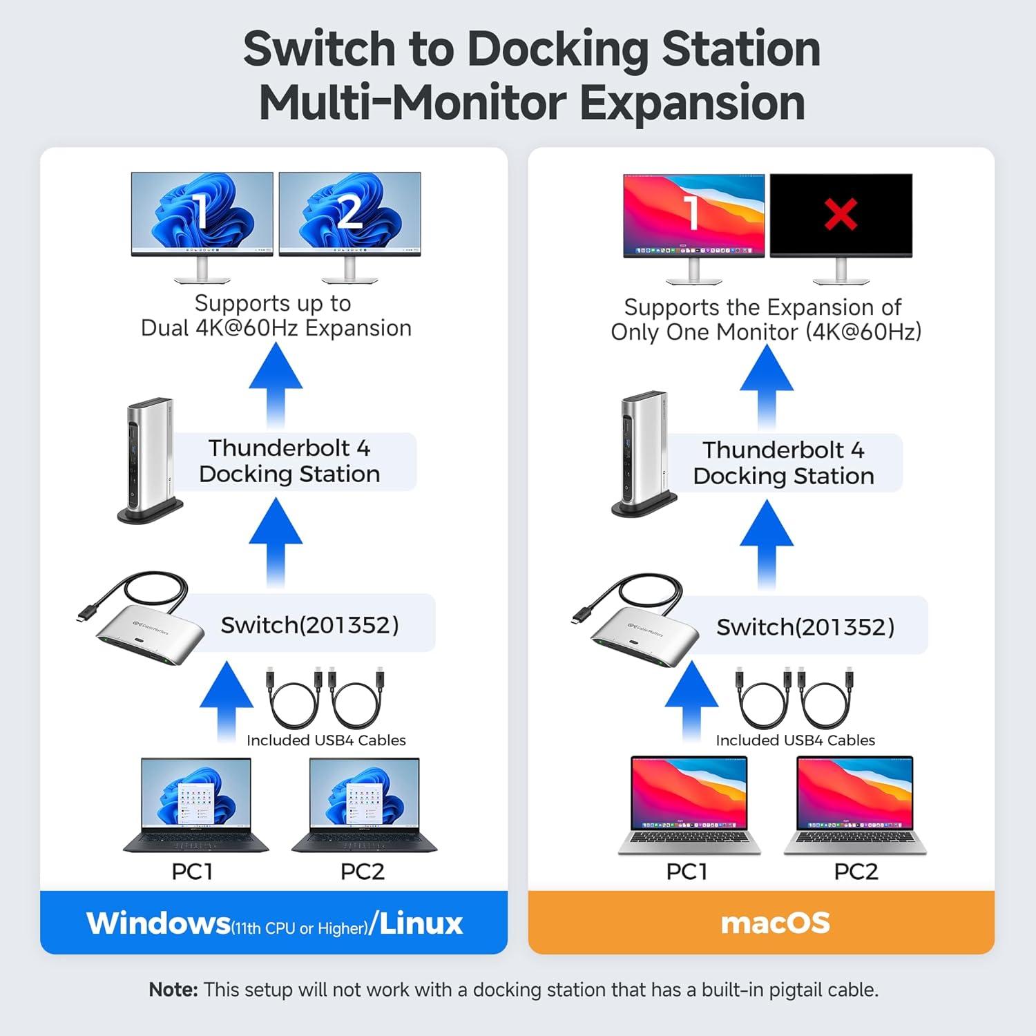 Docking Station Conversion: Easily share a USB-C or Thunderbolt 4 docking station between two computers, turning it into a functional Thunderbolt switch or KVM switch. For dual or multi-monitor setups, use a USB-C or Thunderbolt 4 dock with MST support (Windows only). macOS supports only one external display. Avoid USB-C hubs / docks with built-in pigtail cables, as using an extra USB-C coupler will cause compatibility issues.