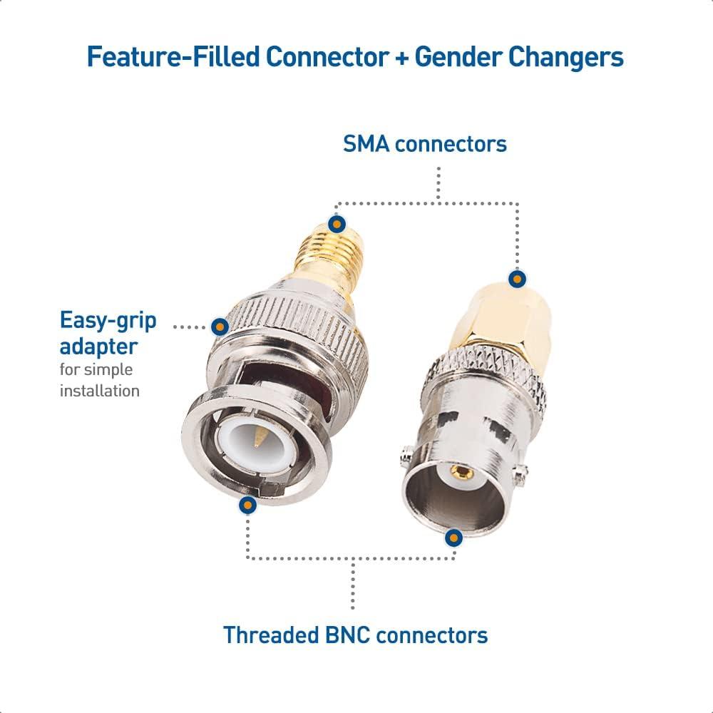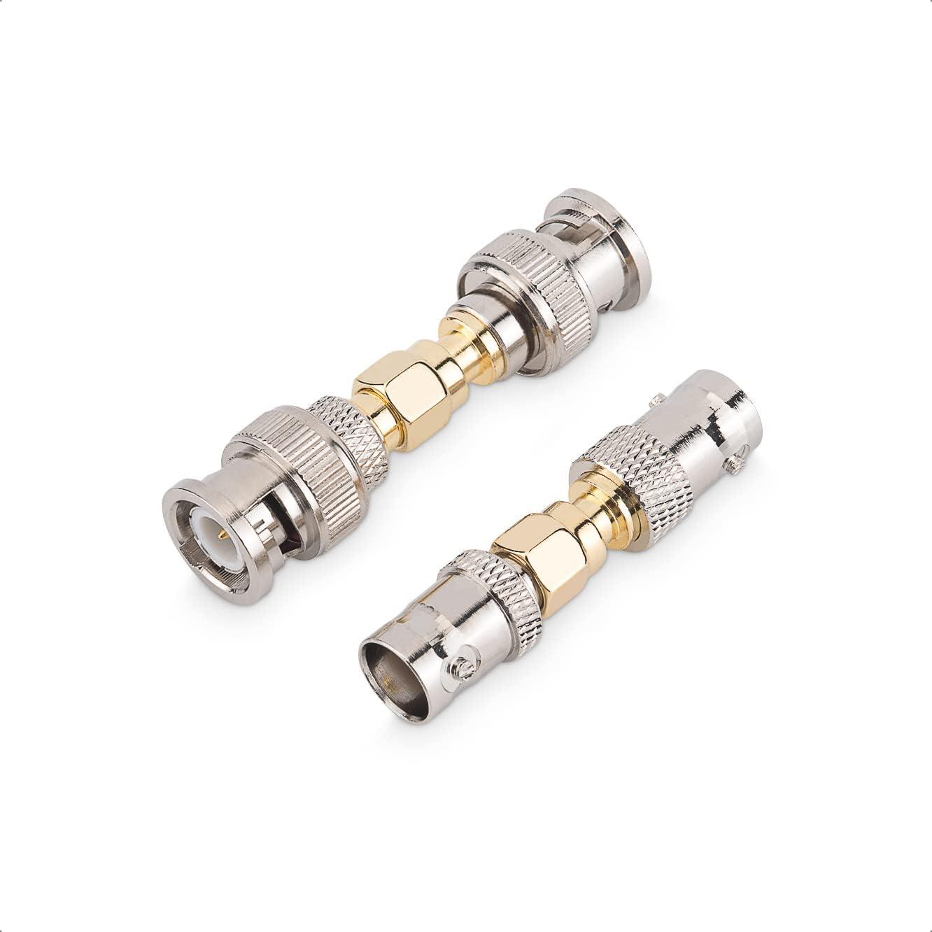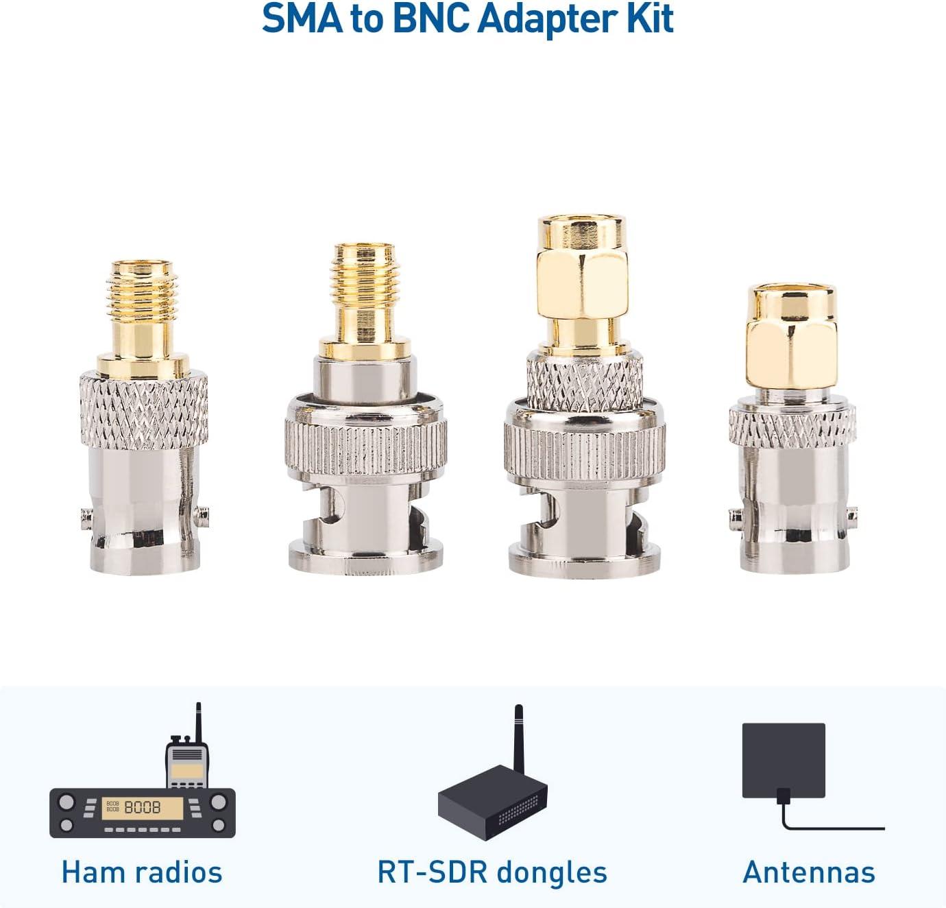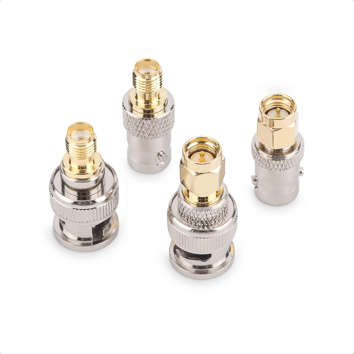 The 4-pack of adapters includes gender and connector changers for BNC and SMA; It includes 1 BNC male to SMA male adapter, 1 BNC female to SMA female adapter, 1 SMA female to BNC male adapter, and 1 SMA male to BNC female adapter