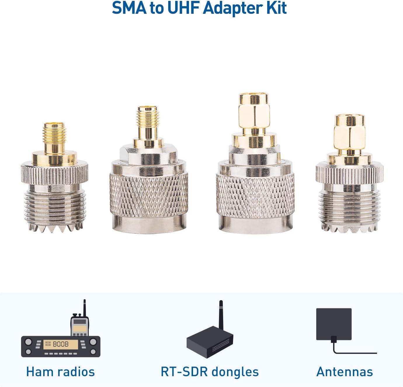The 4-pack of adapters includes gender and connector changers for SO239 and SMA; Kit includes 1 SO239 female to SMA male adapter, 1 SO239 female to SMA female adapter, 1 PL259 male to SMA male adapter, and 1 PL259 male to SMA female adapter
