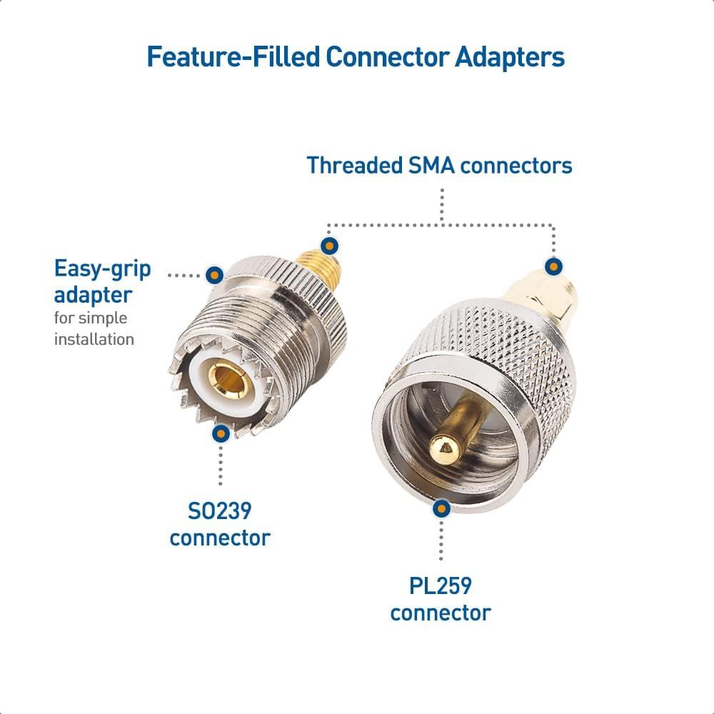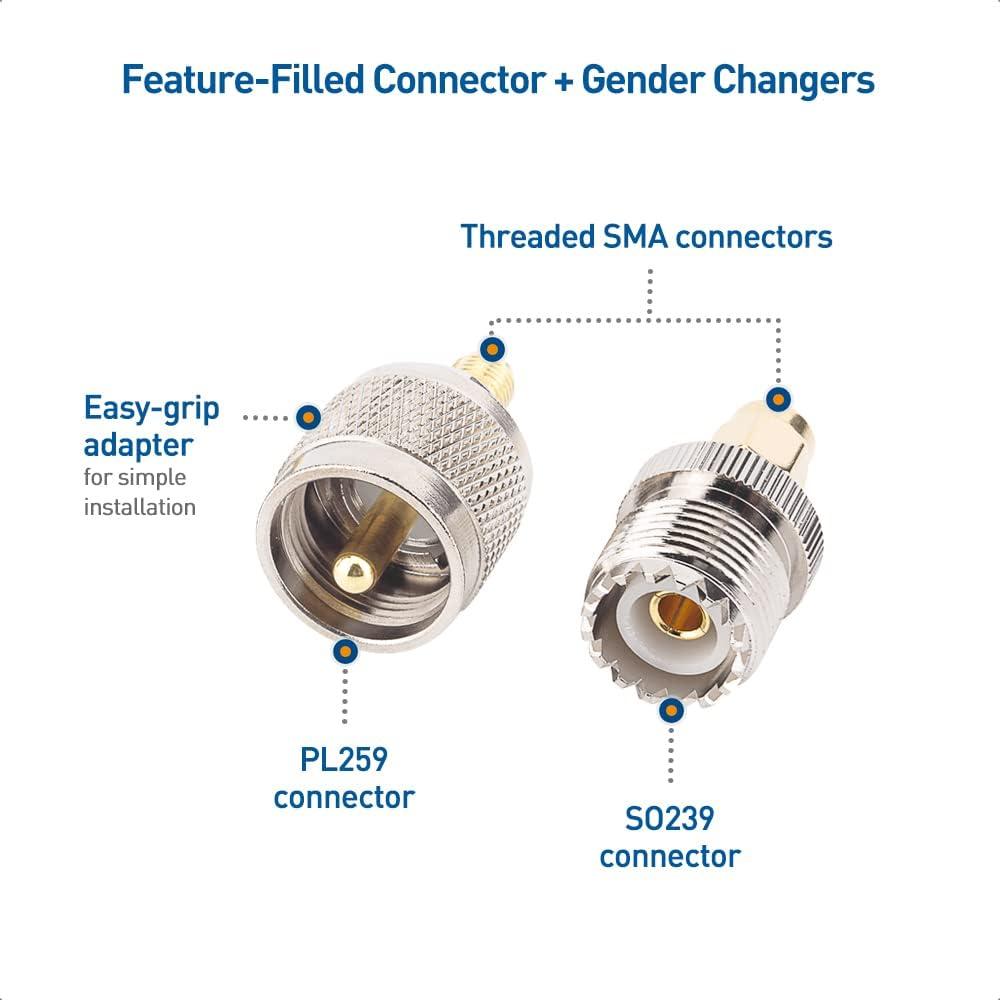 Ham radio antenna cable kit is ideal for converting between SMA popular on ham radio equipment to the UHF antenna connector standard commonly used on antennas