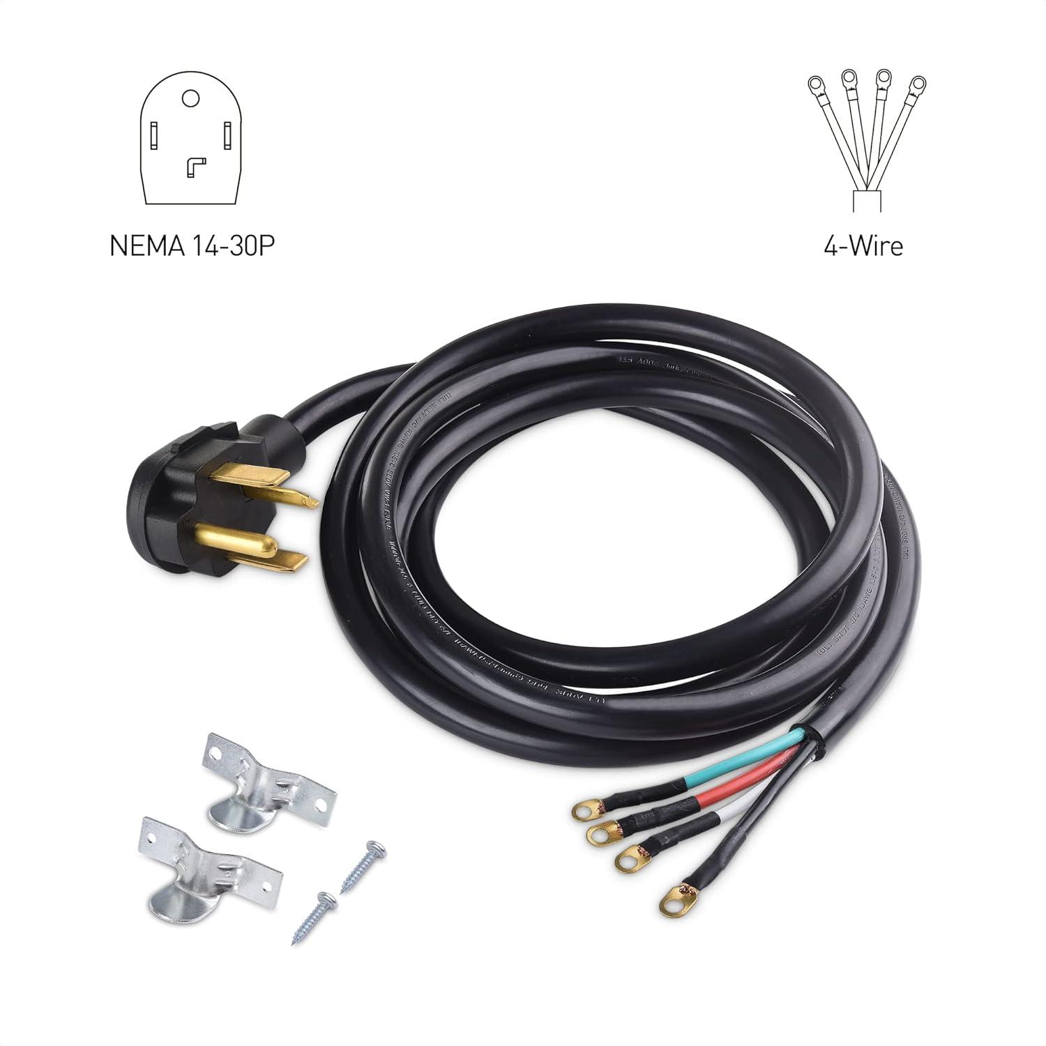 4 wire dryer cord with a NEMA 14-30 plug, designed for compatibility with most newer dryer models. Some brands, such as Electrolux, Frigidaire, Speed Queen, and Amana, typically do not include a power cord. Please refer to the manufacturer's website to confirm whether an appliance power cord is required for your specific model