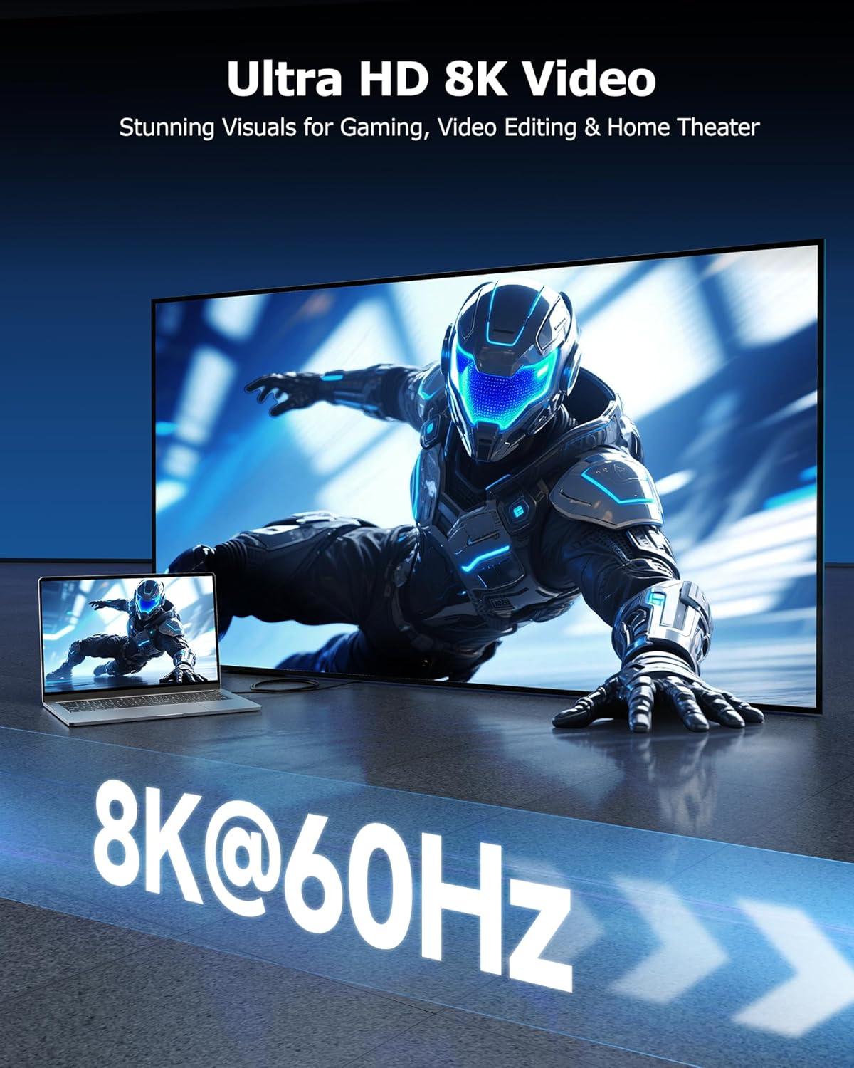 8K & 4K Video Support with DP Alt Mode: This 8K USB-C cable supports DP Alt Mode, enabling 8K and 4K ultra-high-resolution video at high refresh rates. The USB C monitor cable is ideal for connecting USB-C devices to USB-C monitors or docking stations for gaming, editing, and streaming.