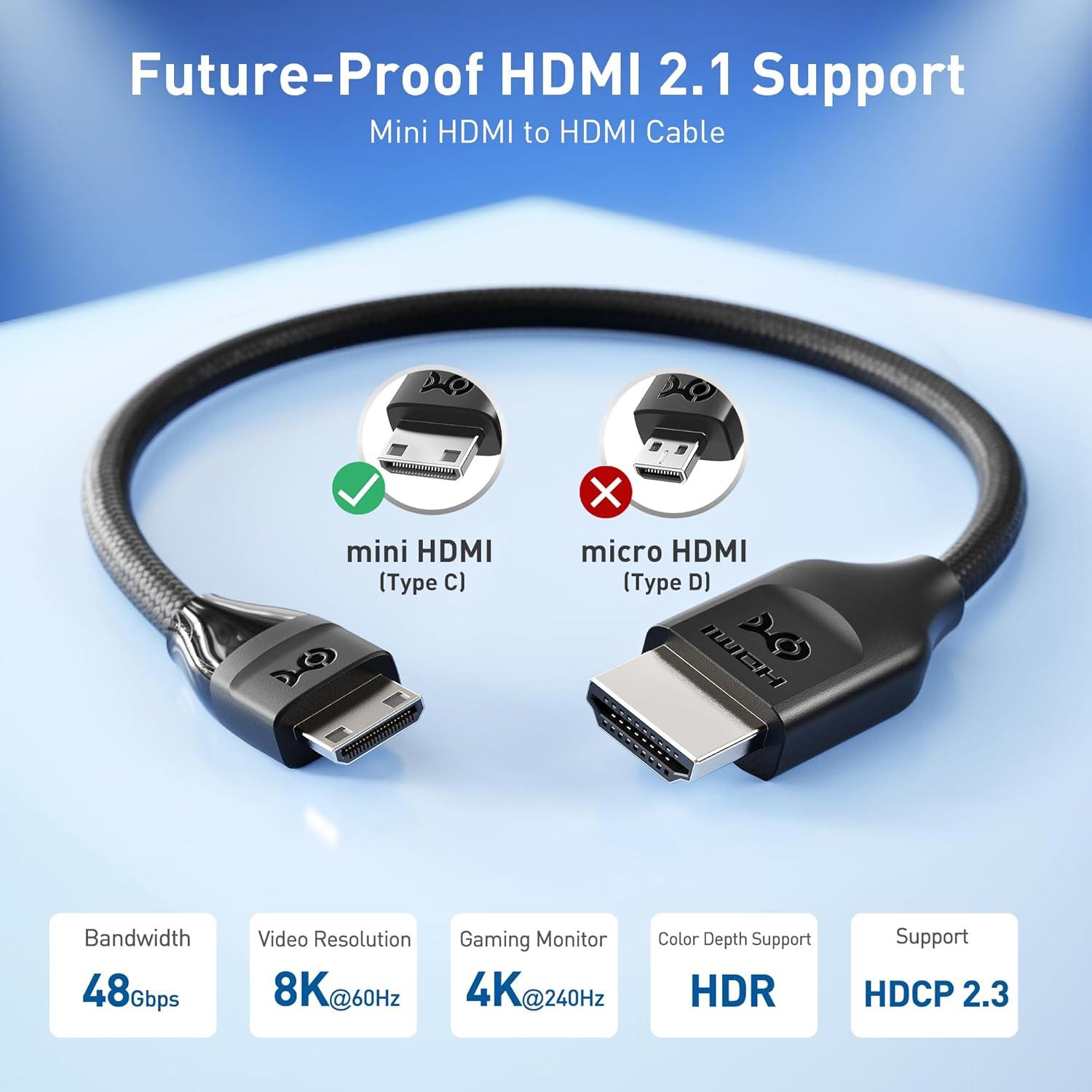 Advanced HDMI 2.1 Support: This HDMI mini to HDMI cable supports 8K@60Hz and 4K@240Hz for smooth gaming and high-quality video. Enjoy features like Dynamic HDR, HDMI eARC, Auto Low Latency Mode (ALLM), Variable Refresh Rate (VRR), and HDCP 2.3—all in one Mini HDMI cable.