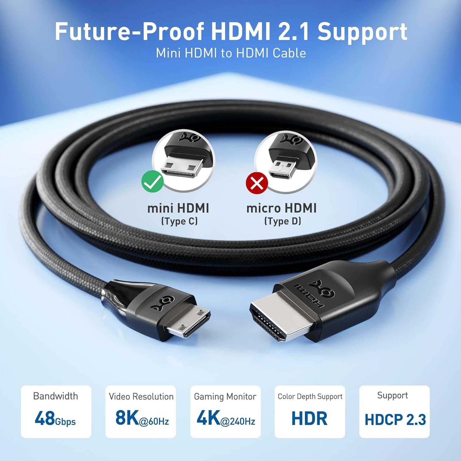 Advanced HDMI 2.1 Support: This HDMI mini to HDMI cable supports 8K@60Hz and 4K@240Hz for smooth gaming and high-quality video. Enjoy features like Dynamic HDR, HDMI eARC, Auto Low Latency Mode (ALLM), Variable Refresh Rate (VRR), and HDCP 2.3—all in one Mini HDMI cable.