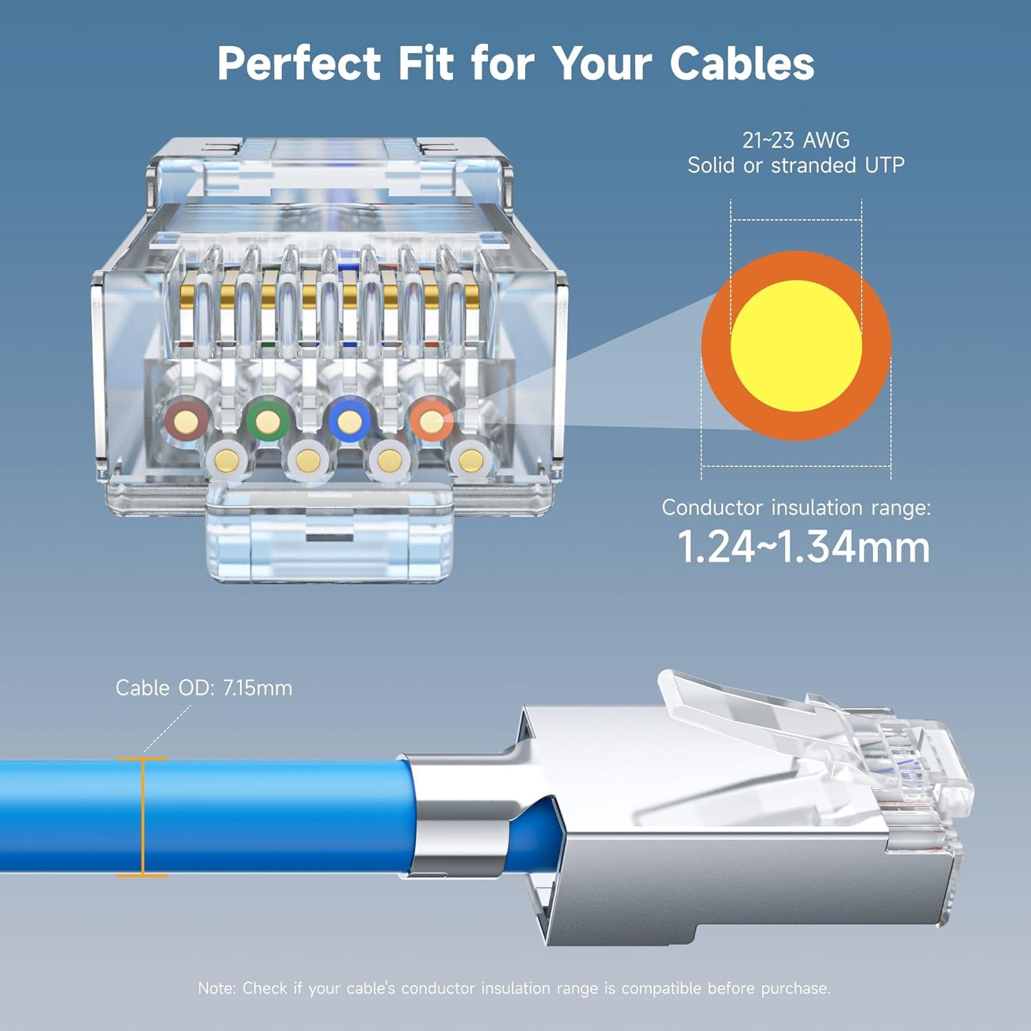 Cat 6A Performance for 10 Gigabit: Each RJ45 connector is rated for 10 GBASE-T networks and supports 21 to 23 AWG solid or stranded wire with 1.24 to 1.34mm insulated conductors and an outside diameter of up to 7.15mm. Backward compatible with Cat 6 cable and Cat 5e bulk cable, ensuring reliable terminations across multiple standards.