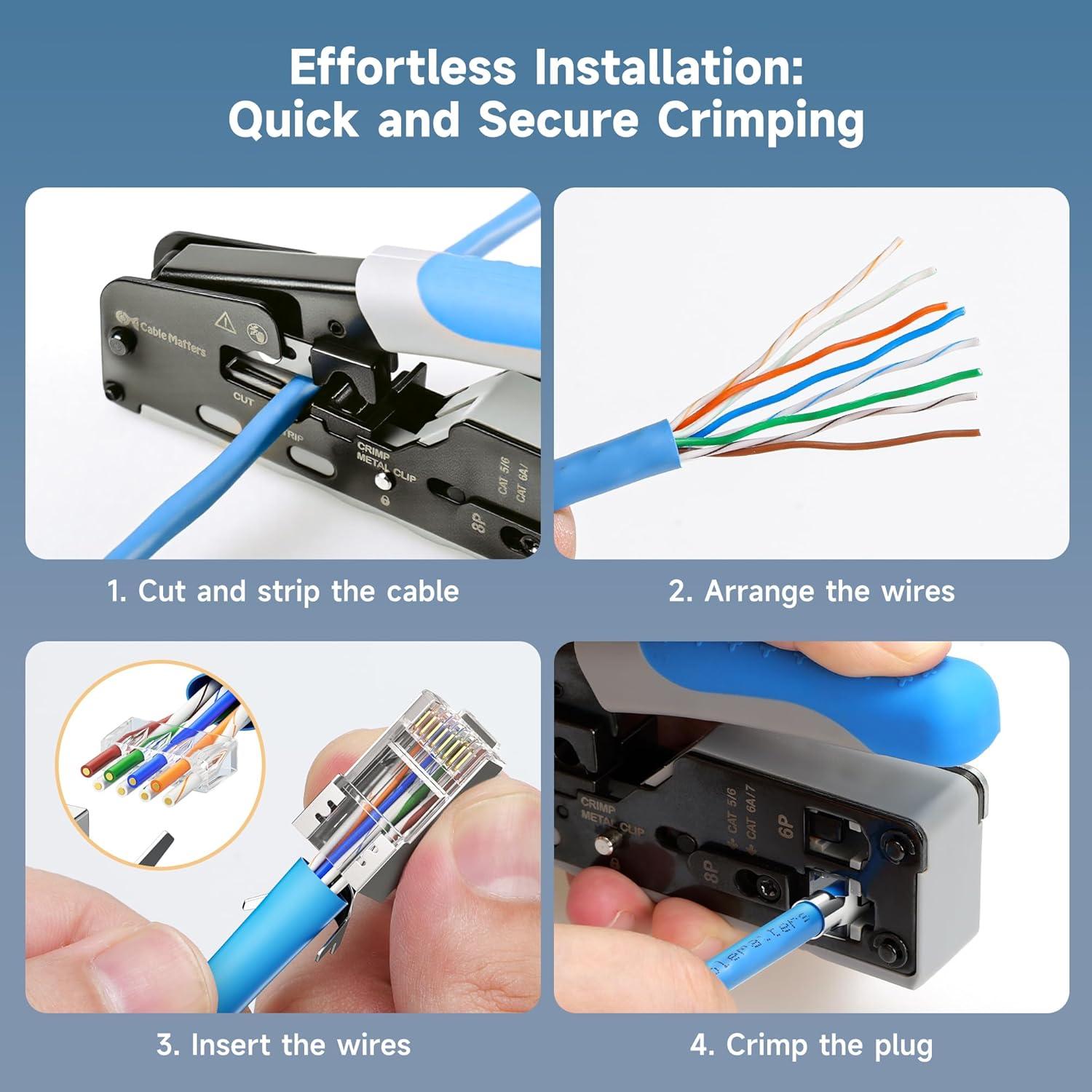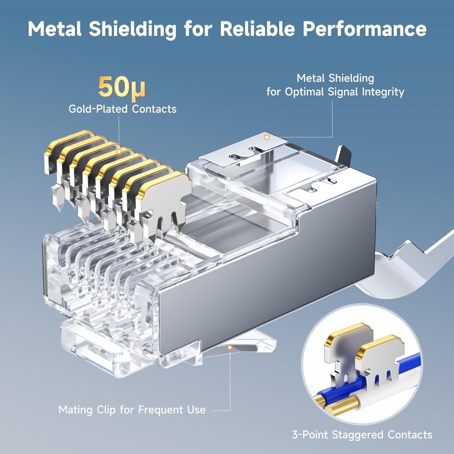 Premium Construction with 50μ Gold Plated Contacts: Each STP wire connector features a sturdy metal housing, integrated strain relief boot, and 50μ gold plated contacts. Crimp-style plugs with three-point staggered contacts ensure reliable performance, enhanced corrosion resistance, and strong signal integrity for shielded Cat6A cable terminations.