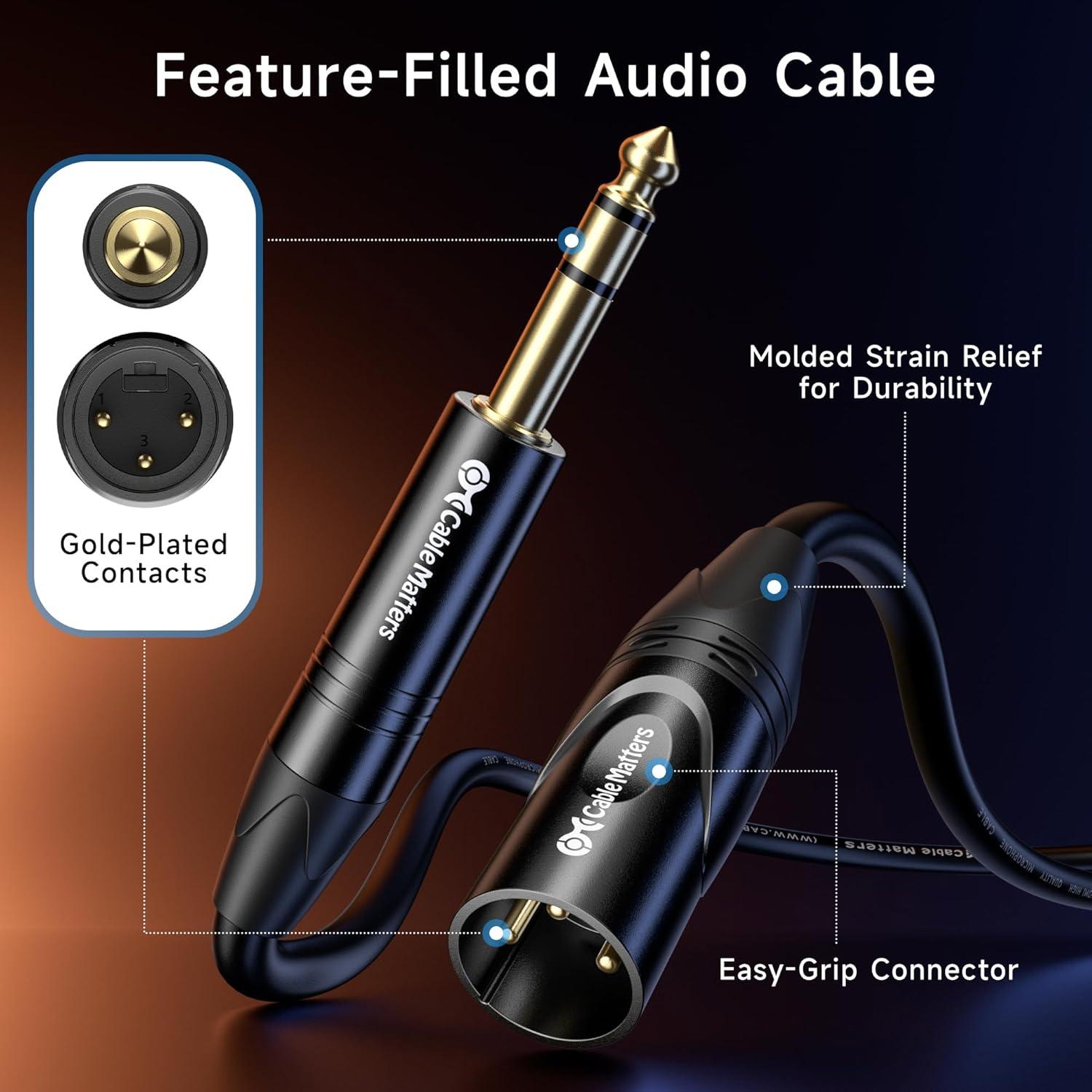 The XLR male to 1/4 cable has copper braided shielding to provide maximum cancellation of hum and noise; Polyethylene insulation improves high frequency response of the 1/4 inch to XLR cable
