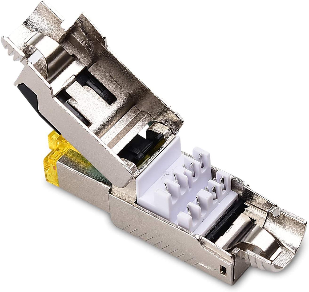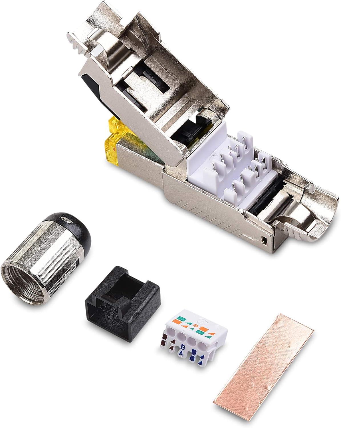 Superior construction of RJ45 connectors combines a one piece metal housing with an integrated silencing cylinder to suppress EMI, NEXT, and AXT electromagnetic noise and crosstalk; A screw-on metal strain relief boot protects the cable integrity and increases the shielding performance; An IP20 rated dust cover protects the RJ45 contacts when transporting or storing a terminated cable