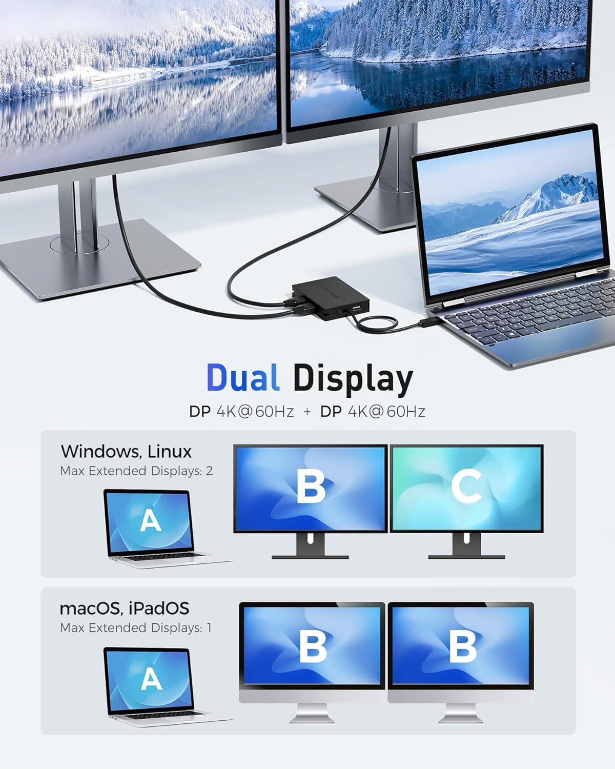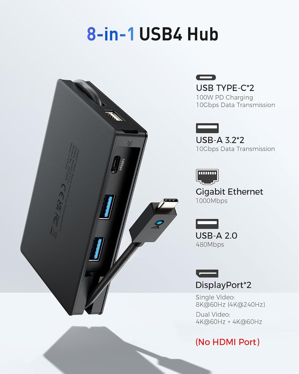 8-in-1 Portable USB4 Multiport Adapter: Revolutionize your on-the-go productivity with the ultimate laptop companion. Despite its compact size, this USB4 Dock with dual DisplayPort video packs an incredible punch, boasting a lightning-fast 40Gbps transmission speed and supporting dual 4K@60Hz Ultra High-Definition videos. Unlike other options limited to USB-C Gen 2's 10 Gbps, our USB 4 Dual DisplayPort Docking Station harnesses the cutting-edge USB4 40Gbps technology, setting it apart from the competition