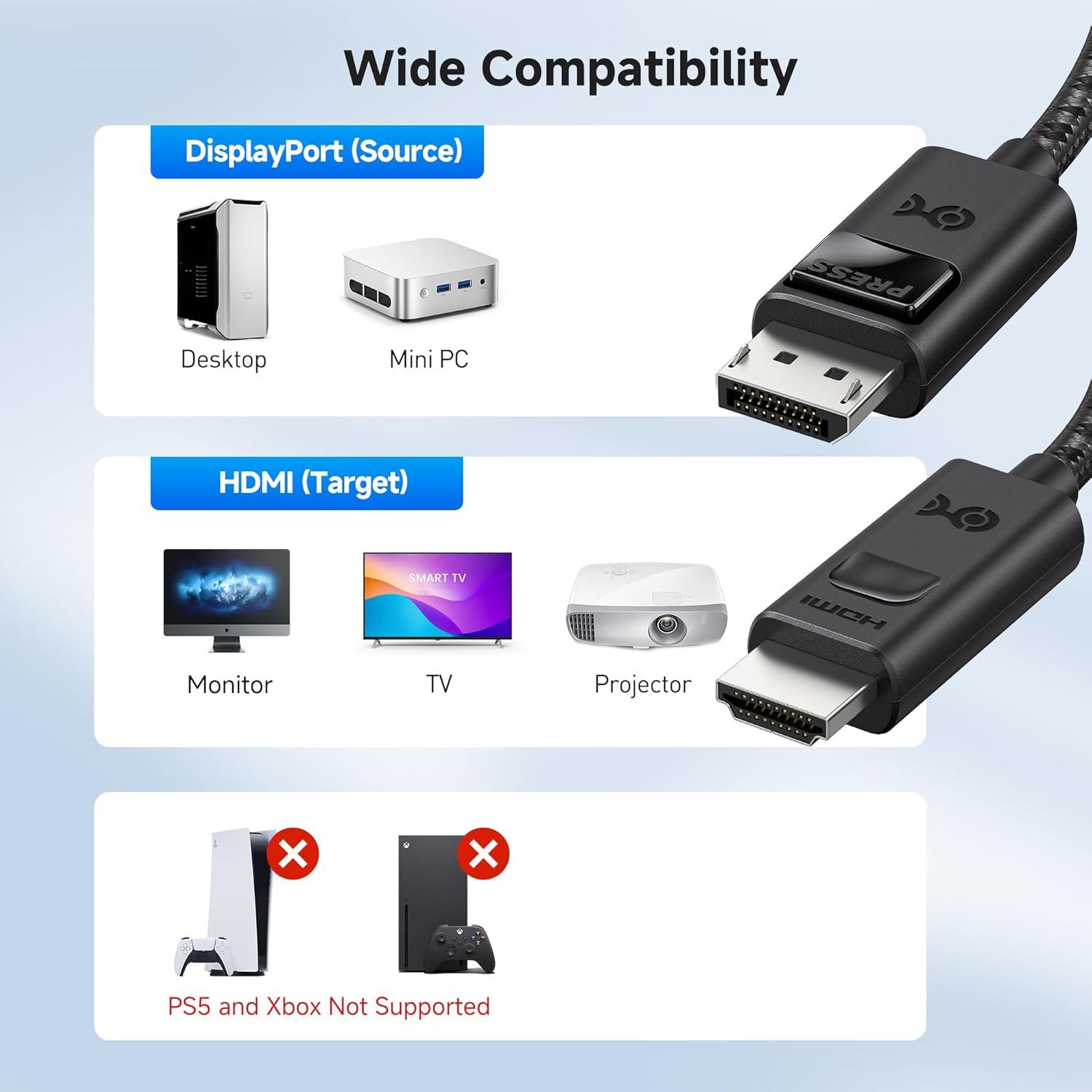 Advanced HDMI and DisplayPort Connection: Elevate your digital experience with our 8K HDMI 2.1 to DisplayPort 1.4 cable, seamlessly connecting DisplayPort sources to HDMI displays. This cable supports the latest standards for unmatched resolution. Important: For Nvidia RTX 20/30 and ATI RX 6000 series users, driver updates may be necessary for optimal resolution. Note: Only works from DP (PC) to HDMI (display). Not compatible with PS5 or Xbox.
