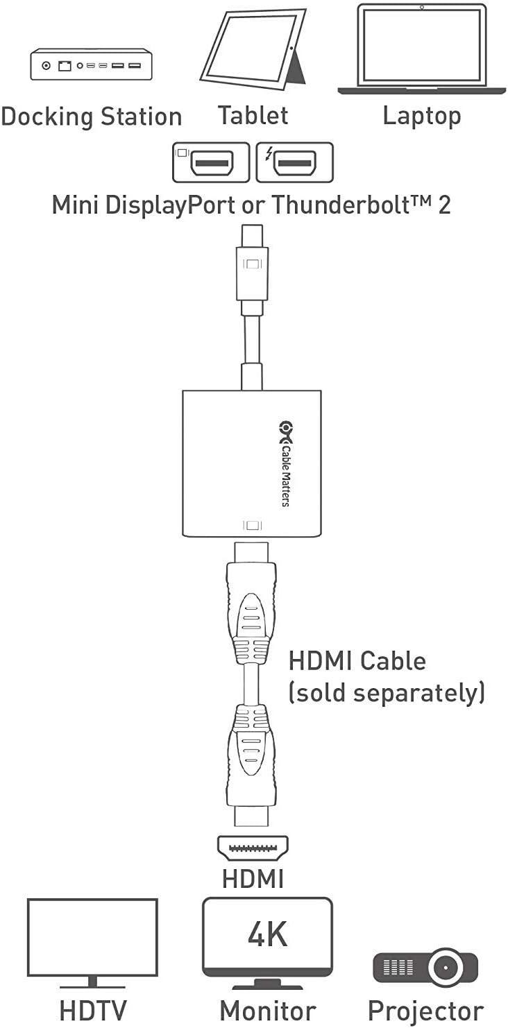 Lightweight and portable Thunderbolt to HDMI adapter for connecting a Mini DisplayPort (Mini DP or mDP)/Thunderbolt 2 port compatible computer to an HDTV, monitor, or projector with HDMI; A separate HDMI cable (sold separately) is required for this HDMI to Mini DisplayPort Adapter