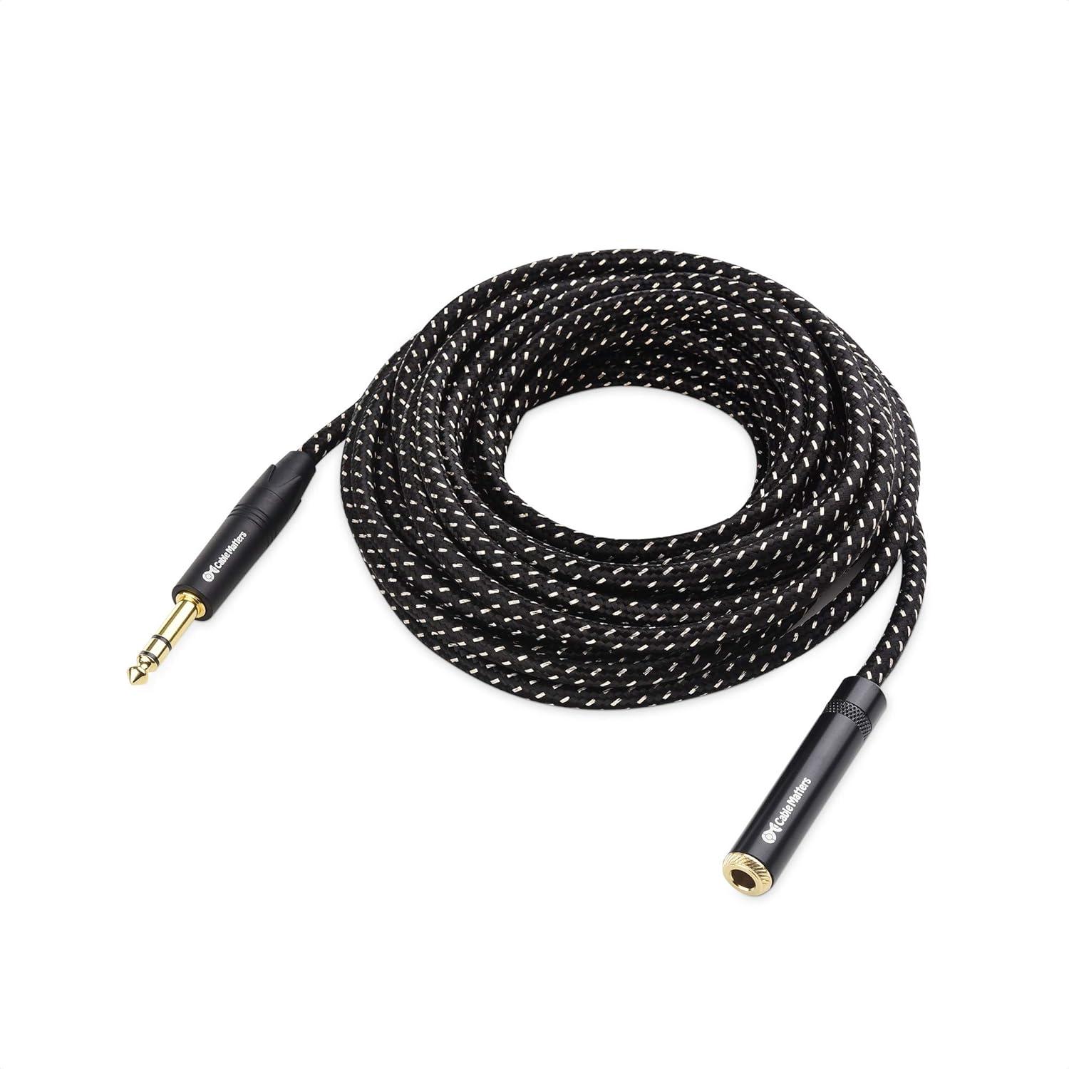 The 1/4 inch headphone extension cable features a braided cable jacket for durability and tangle prevention, and over-molded strain relief for increased durability