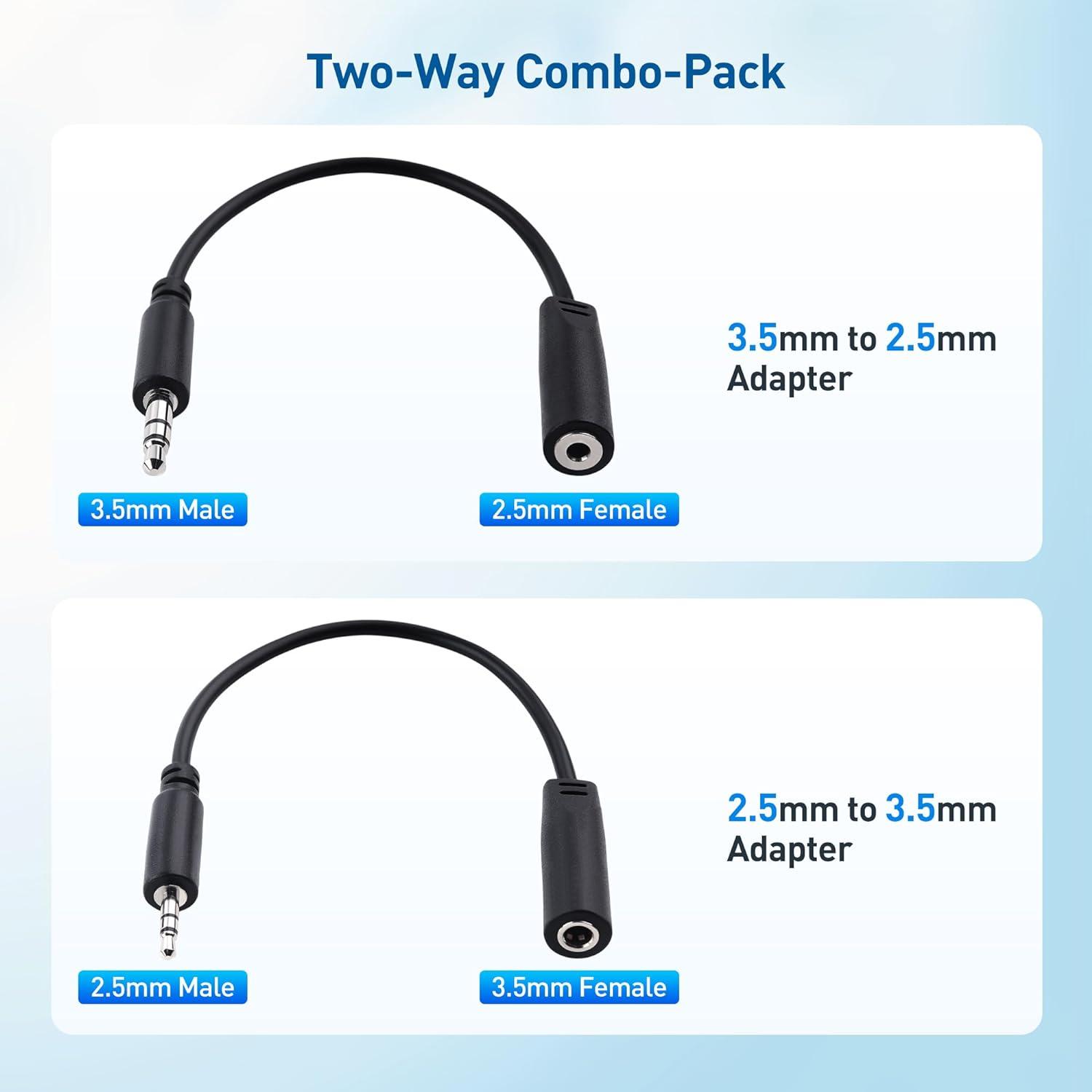Two-Way Combo-Pack: Always be prepared with the right cable connection; These cable adapters are perfect for connecting 3.5mm headphones to older MP3 players, cell phones, or laptops that use a 2.5mm connector; Connect older 2.5mm headphones to a 3.5mm device with the 3.5mm male to 2.5mm female cable and 2.5 to 3.5 adapter