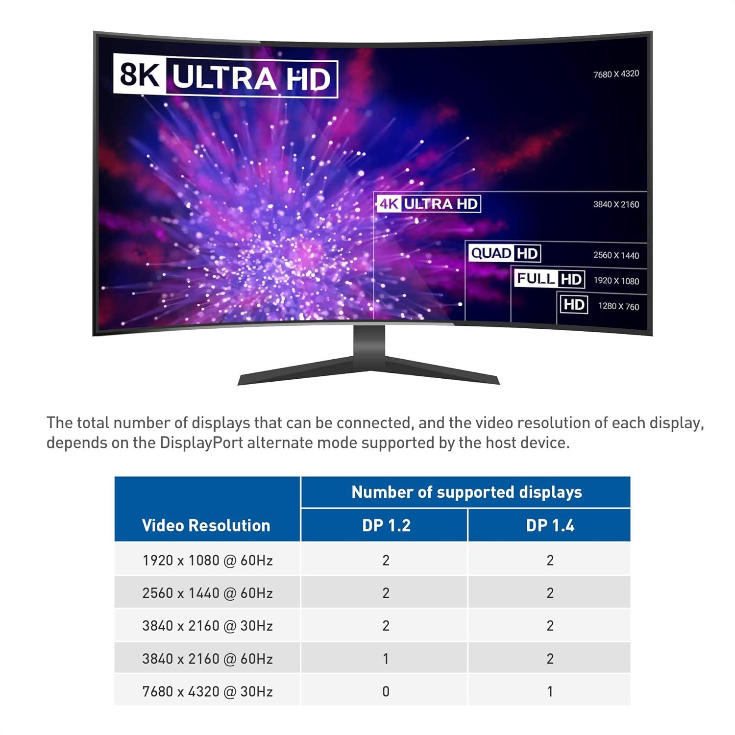 USB C docking station dual monitor leverages the latest DisplayPort 1.4 technology for high-resolution dual monitor support; Add up to two 4K @60Hz DisplayPort monitors with the USB C DisplayPort adapter; USB-C hub also supports a single 8K @30Hz monitor with the latest DisplayPort 1.4 Display Stream Compression (DSC) technology; Hub USB C is backward compatible with 1440p, 1080p, and lower resolutions