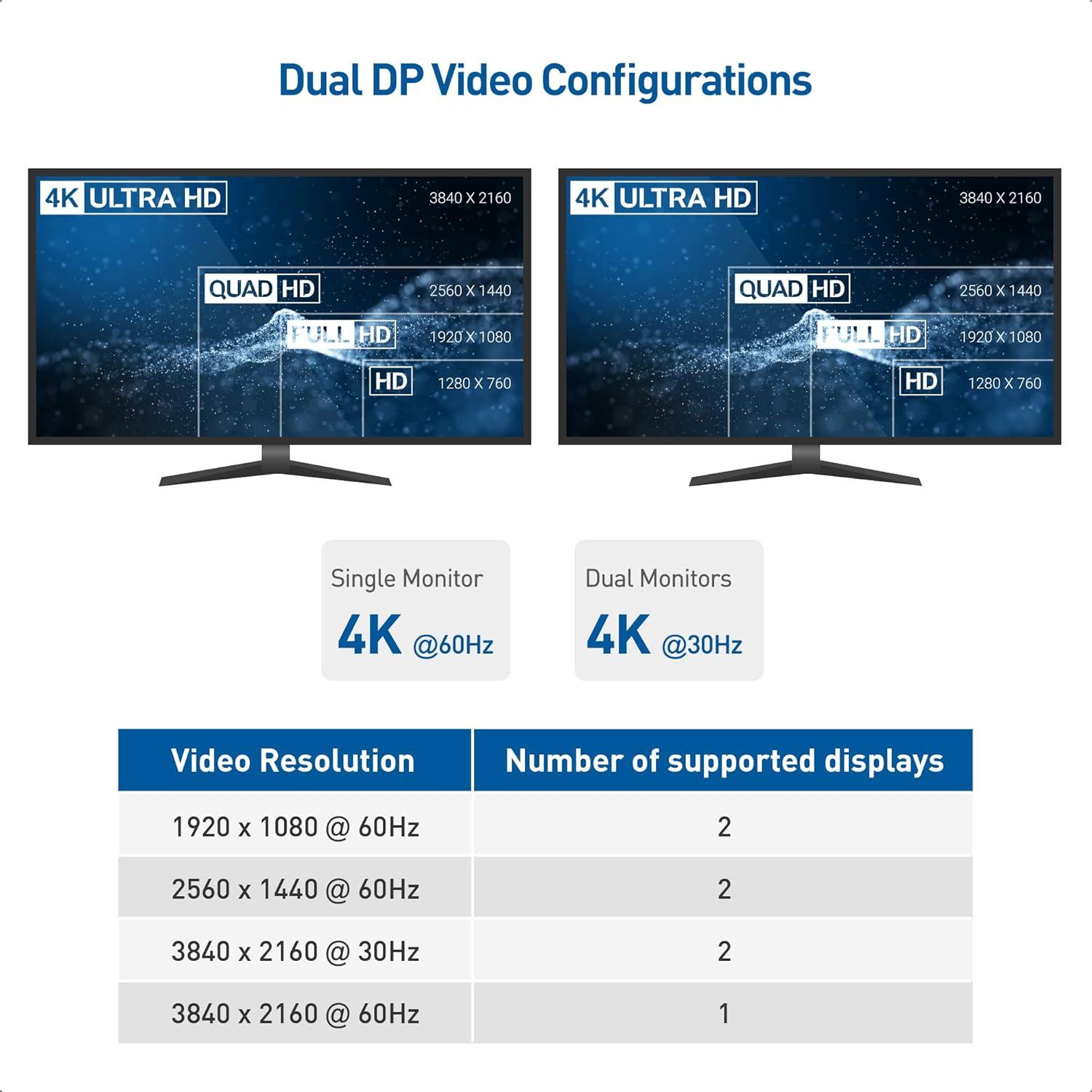 Bus-powered USB C to Dual DisplayPort adapter supports dual monitor with Display Port at 3840×2160@30Hz; Dual monitor USB C adapter also supports lower resolution including 1440p and 1080p at 60Hz offered by the DisplayPort MST technology; Thunderbolt 3 compatible for use as a Thunderbolt 3 hub