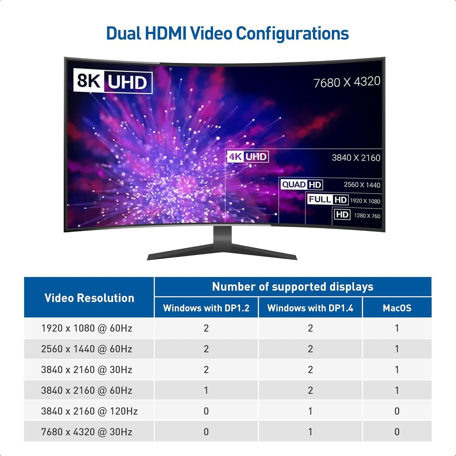 Bus-powered USB C to Dual HDMI adapter supports dual monitor with HDMI at 3840×2160@60Hz; Dual monitor USB C adapter also supports lower resolution including 1440p and 1080p at 60Hz offered by the DisplayPort MST technology. Thunderbolt 3 compatible for use as a Thunderbolt 3 hub