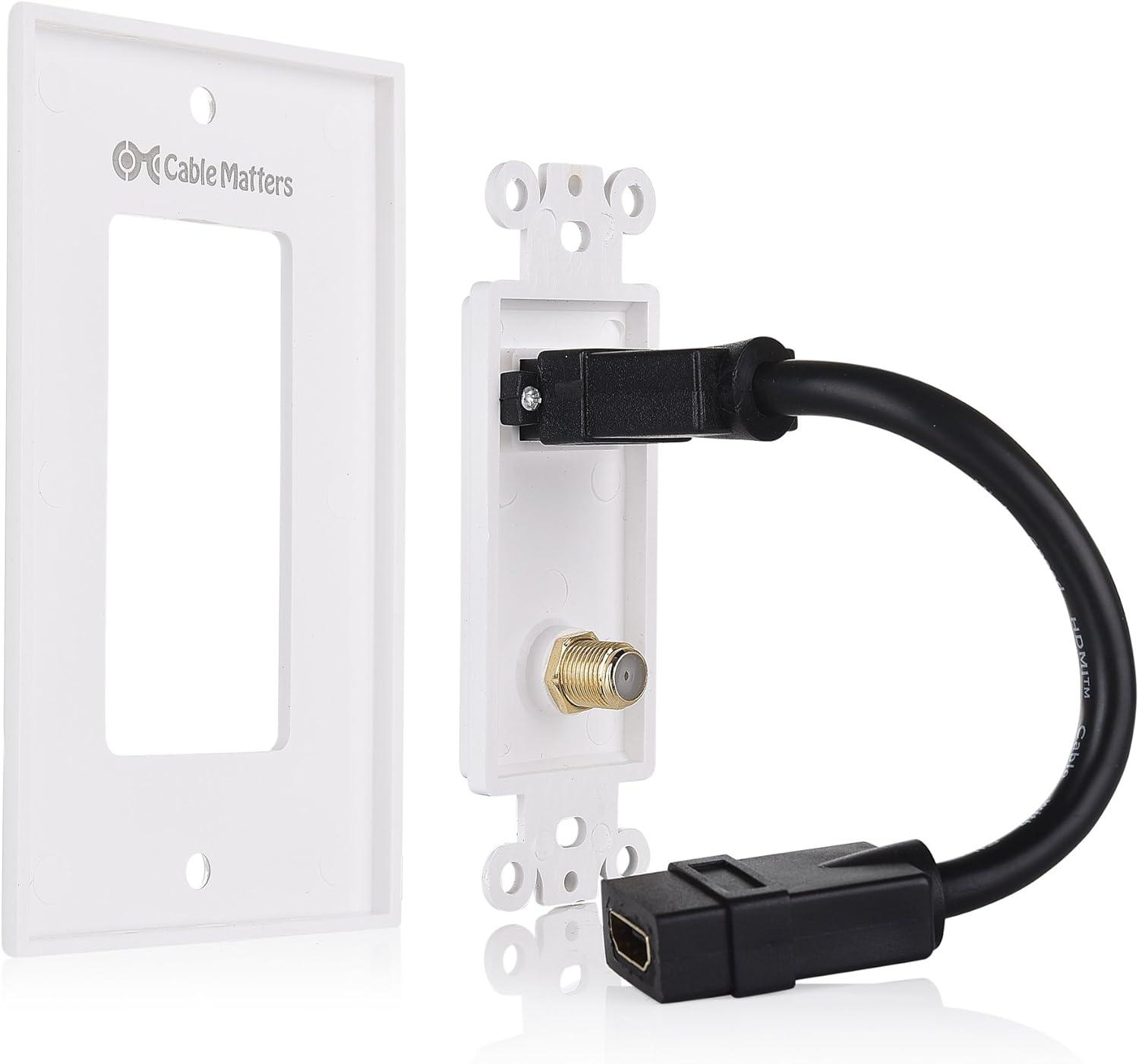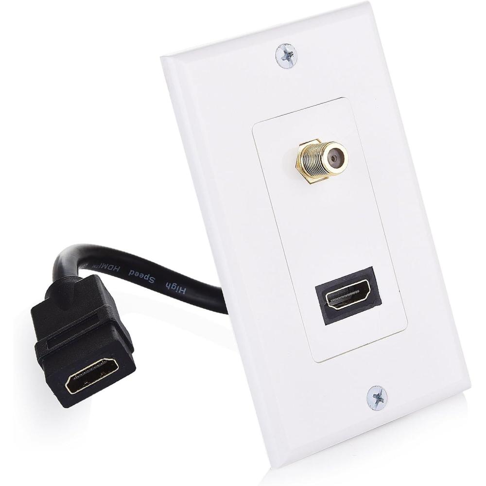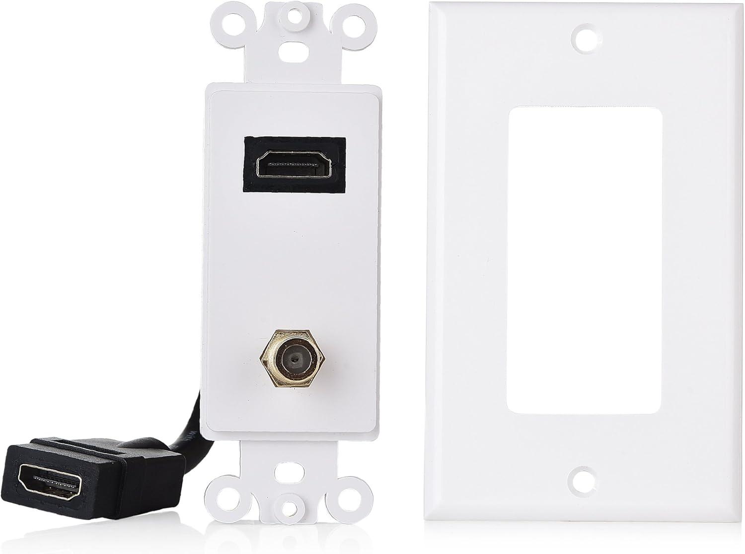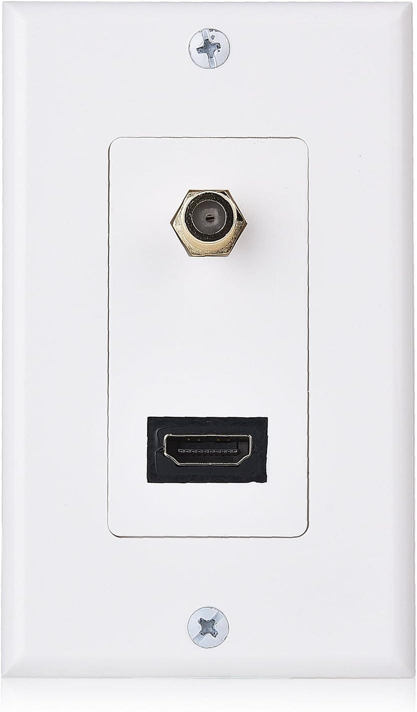 Coax wall jack has a standard F-connector used by cable companies to connect a modem, router or CATV box; Coax coupler wall plate provides pass-thru of video and data from an RG6 coaxial cable; Replace a broken outlet or add an expansion location in the bedroom with HDMI