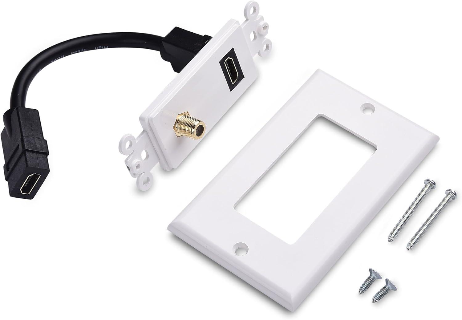 Two-piece outlet with included faceplate and HDMI + coaxinsert makes connecting the cables easier; Simple installation of HDMI coax wall plate 4K insert with the included mounting screws; 4-inch HDMI pigtail cable on the rear of the insert helps connect the HDMI cable