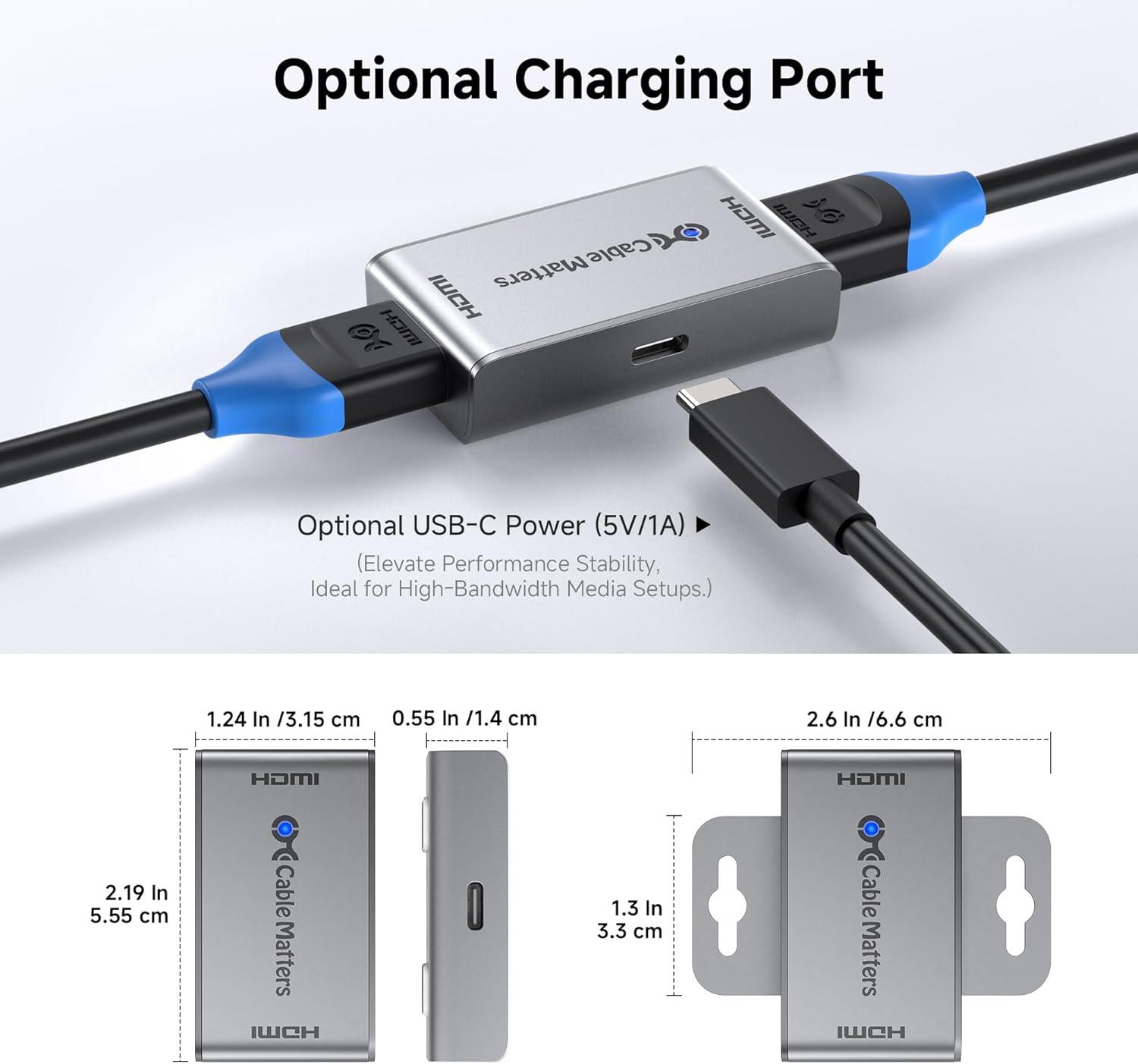 Optional Power for Weak Signals: This 8K HDMI coupler female to female offers a USB-C power option (5V/1A) using a charging cable and wall charger (sold separately). Ideal for extending connections from tablets, notebooks, or devices with low HDMI signal output to TVs and projectors.