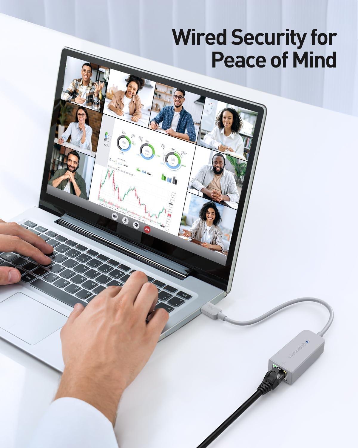 Wireless alternative USB C Ethernet adapter for connecting to the Internet in Wi-Fi dead zones, streaming large video files, or downloading a software upgrade through a wired home of office USBC Ethernet; USB C to LAN adapter provides faster data transfers and better security than most wireless connections