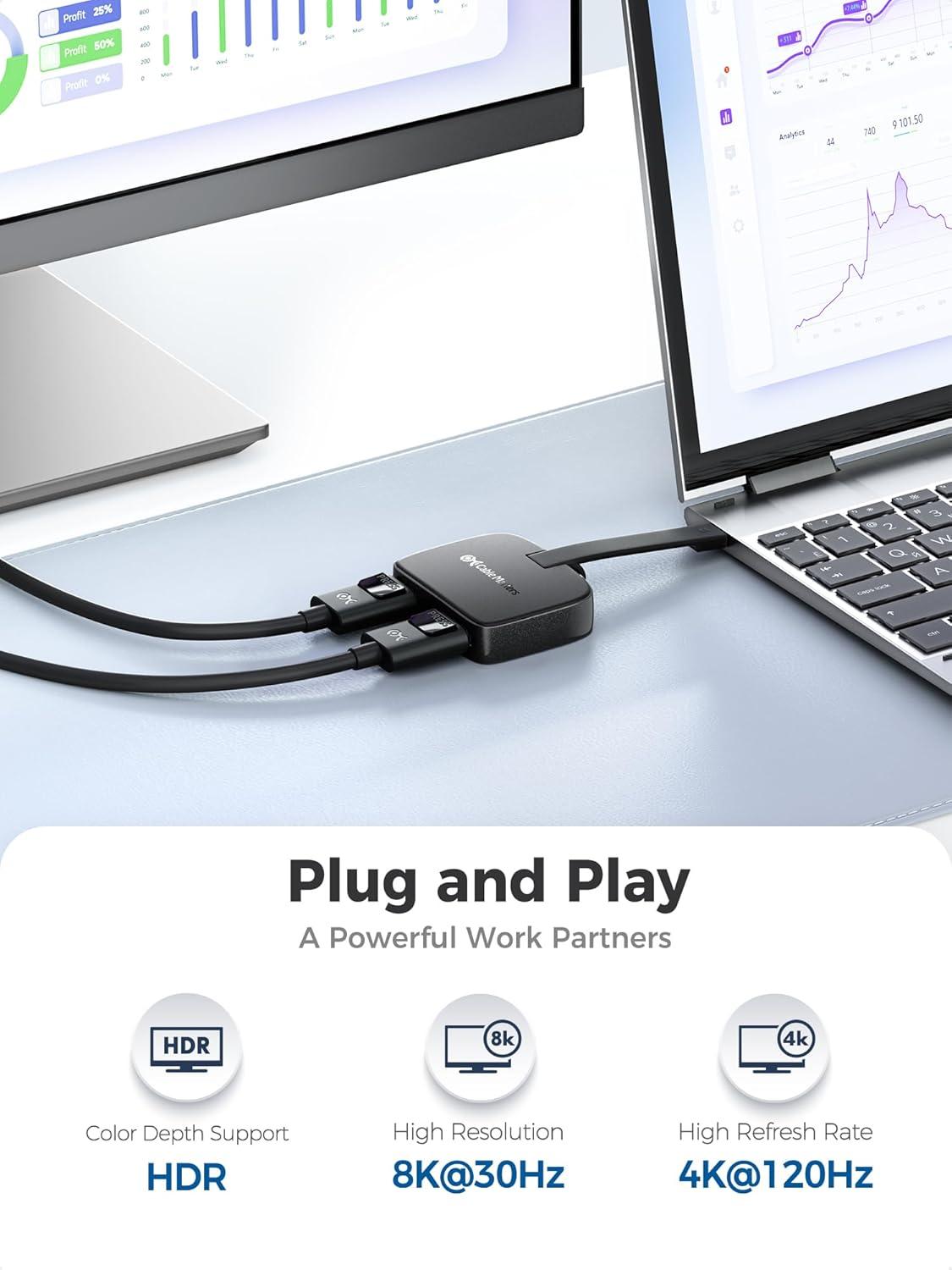 Dual 4K@60Hz Video Adapter: Turn your USB-C port into a video powerhouse with this USB C DisplayPort dual monitor adapter; Connect one 8K monitor or dual 4K monitors with this sleek, stylish, and durable USB-C to dual video adapter