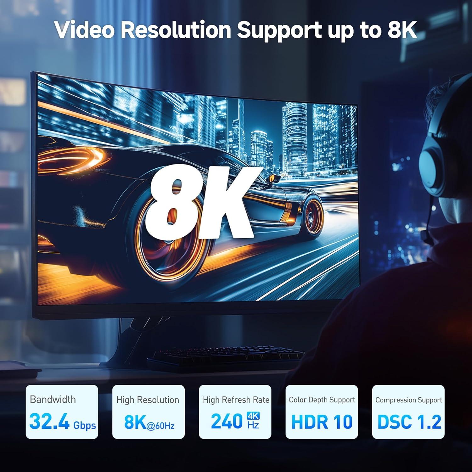 High-Resolution Gaming and Streaming: Enjoy smooth gaming and ultra-high-definition streaming with support for resolutions up to 8K (7680×4320), 4K Ultra HD (3840×2160), and 240Hz refresh rates. The right angle DisplayPort 1.4 cable is ideal for connecting high-end graphics cards to your gaming monitor.