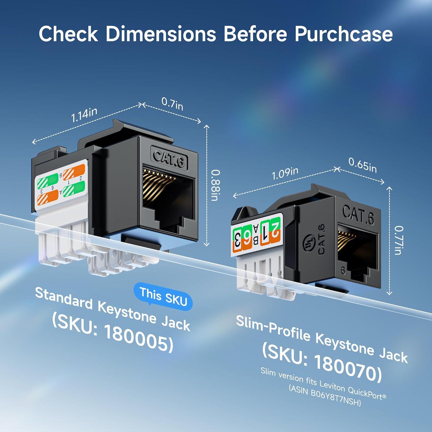 High-Performance Cat6 Keystone Jack: Delivers up to 10 Gigabit Ethernet speeds while remaining fully backward compatible with 10/100 Mbps Ethernet. Each Ethernet keystone jack meets or exceeds Category 6 performance standards (ANSI/TIA/EIA 568-C.2), making it ideal for high-speed, future-proof networking.