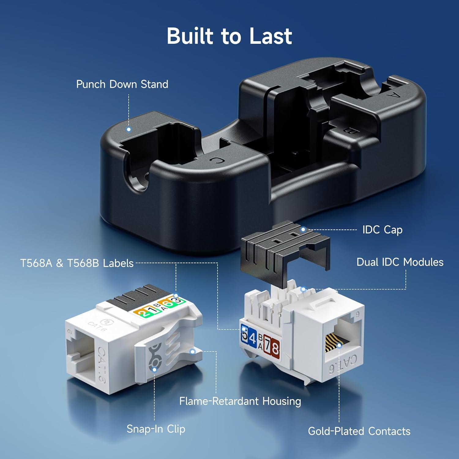 Cost-Effective 25-Pack: This value 25-pack of Cat 6 keystone jacks includes a convenient punch-down stand for easier, safer cable termination. Ideal for large home or office installs. Each Cat 6 jack (Cat6 jack) is backed by a lifetime warranty for long-term reliability in structured cabling systems.