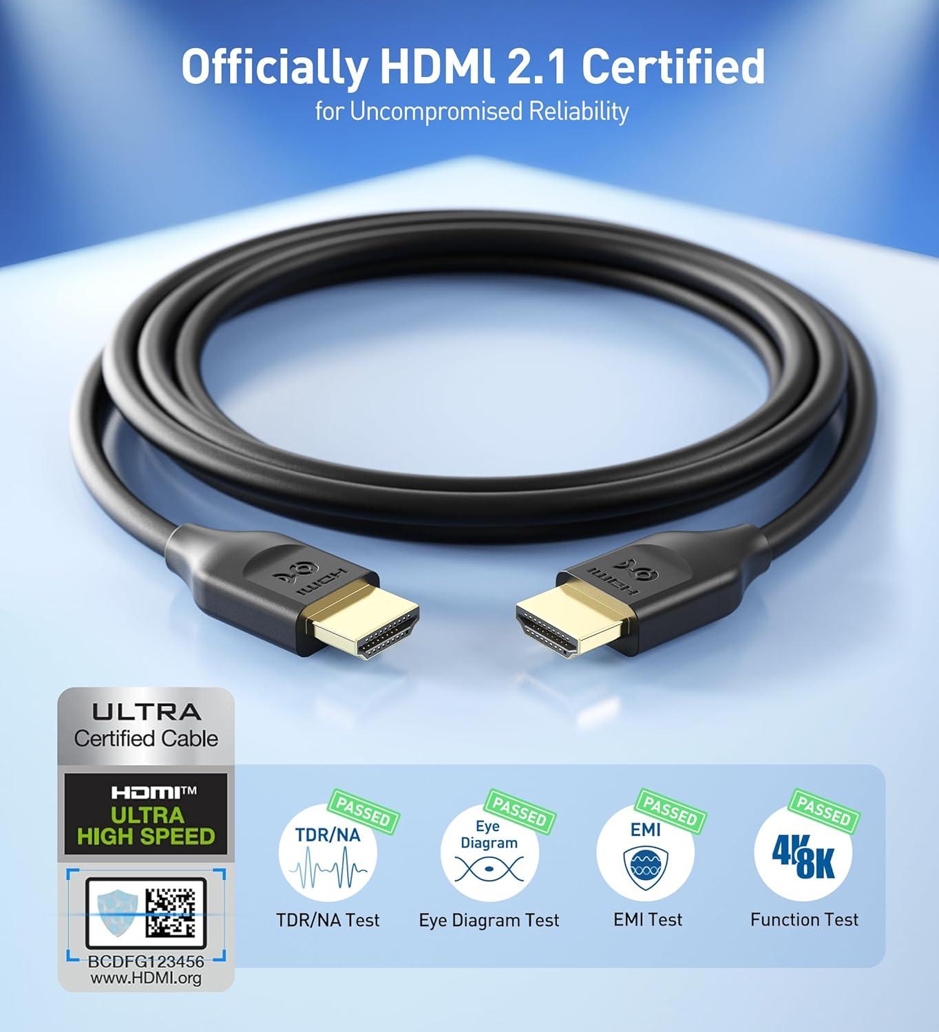 Ultra High speed HDMI to HDMI cable supports up to 8K (7680×4320) including 4K and 1080p; Fully compatible with HDMI eARC (Enhanced Audio Return Channel) features for immersive audio support including Dolby Atmos and DTS X surround sound 7.1 and 5.1