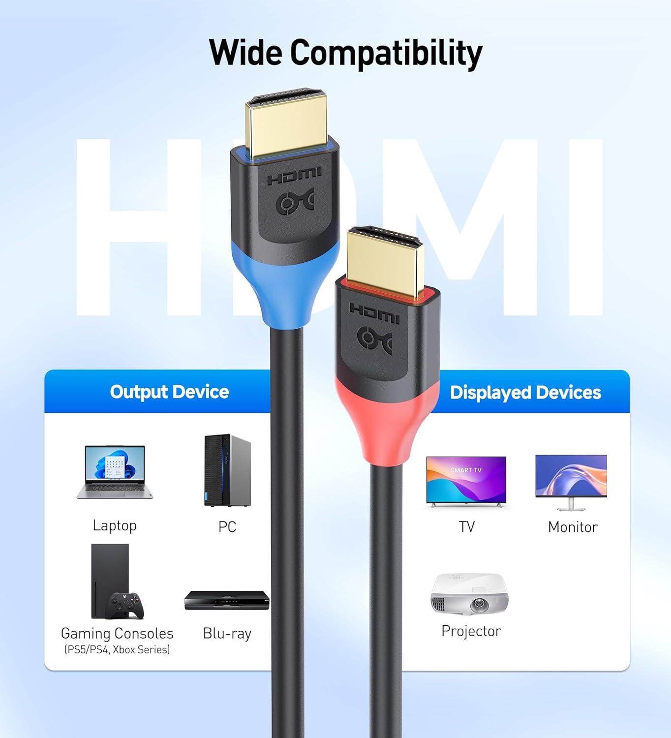 Ultra High speed HDMI to HDMI cable supports up to 8K (7680×4320) including 4K and 1080p; Fully compatible with HDMI eARC (Enhanced Audio Return Channel) features for immersive audio support including Dolby Atmos and DTS X surround sound 7.1 and 5.1