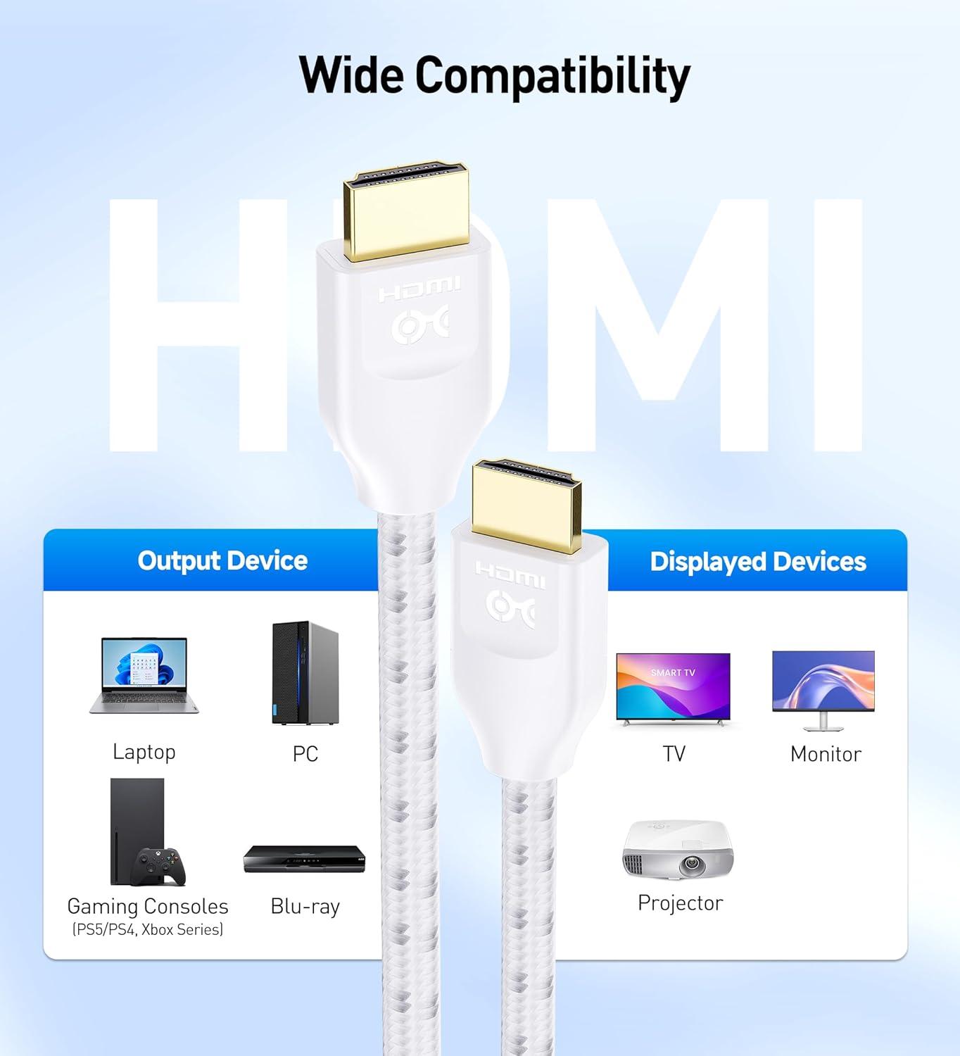 48Gbps HDMI cable white is backward compatible with HDMI 2.0 cable and supports 4:4:4 RGB HDR, 12-bit color, and Dolby Vision