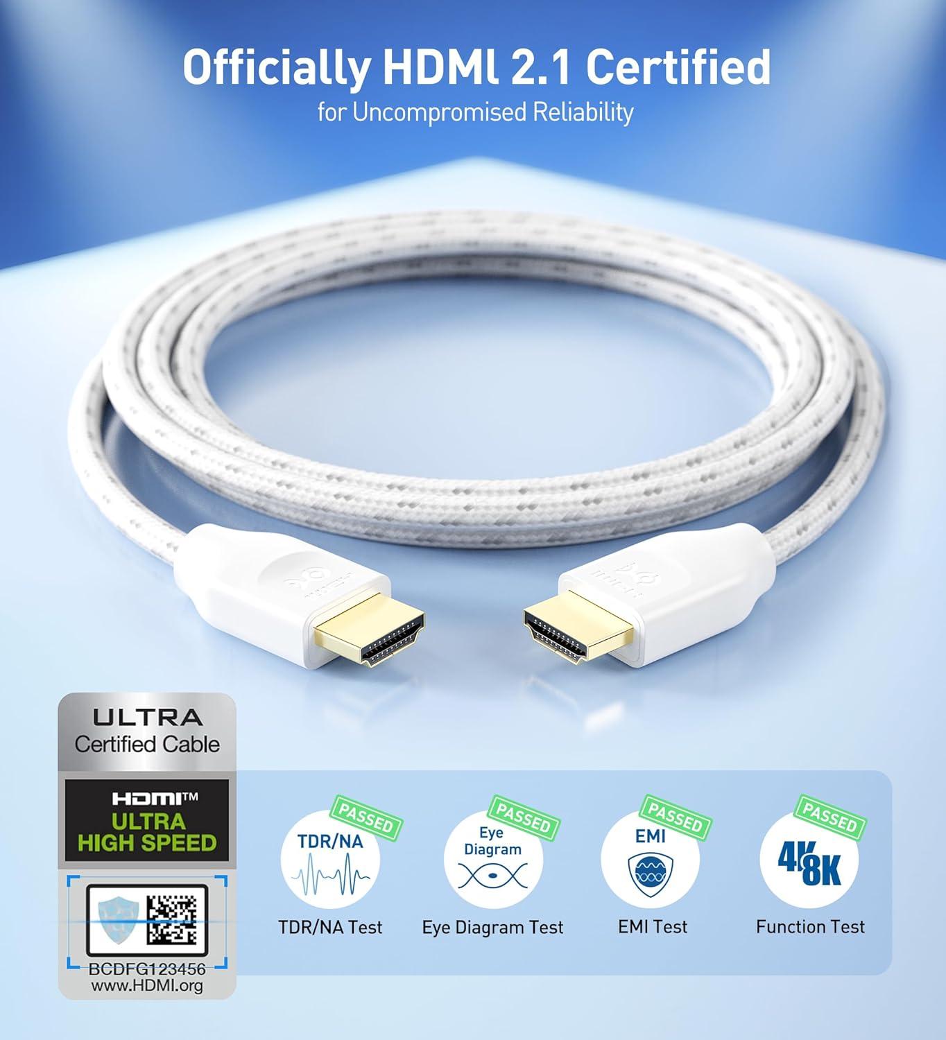 Cable Matters [Ultra High Speed HDMI Certified] Braided 48Gbps 8K HDMI Cable 6.6 ft / 2m with 8K@60Hz, 4K@240Hz and HDR Support for PS5, Xbox Series X/S, RTX3080 / 3090, Apple TV and More in White(White)