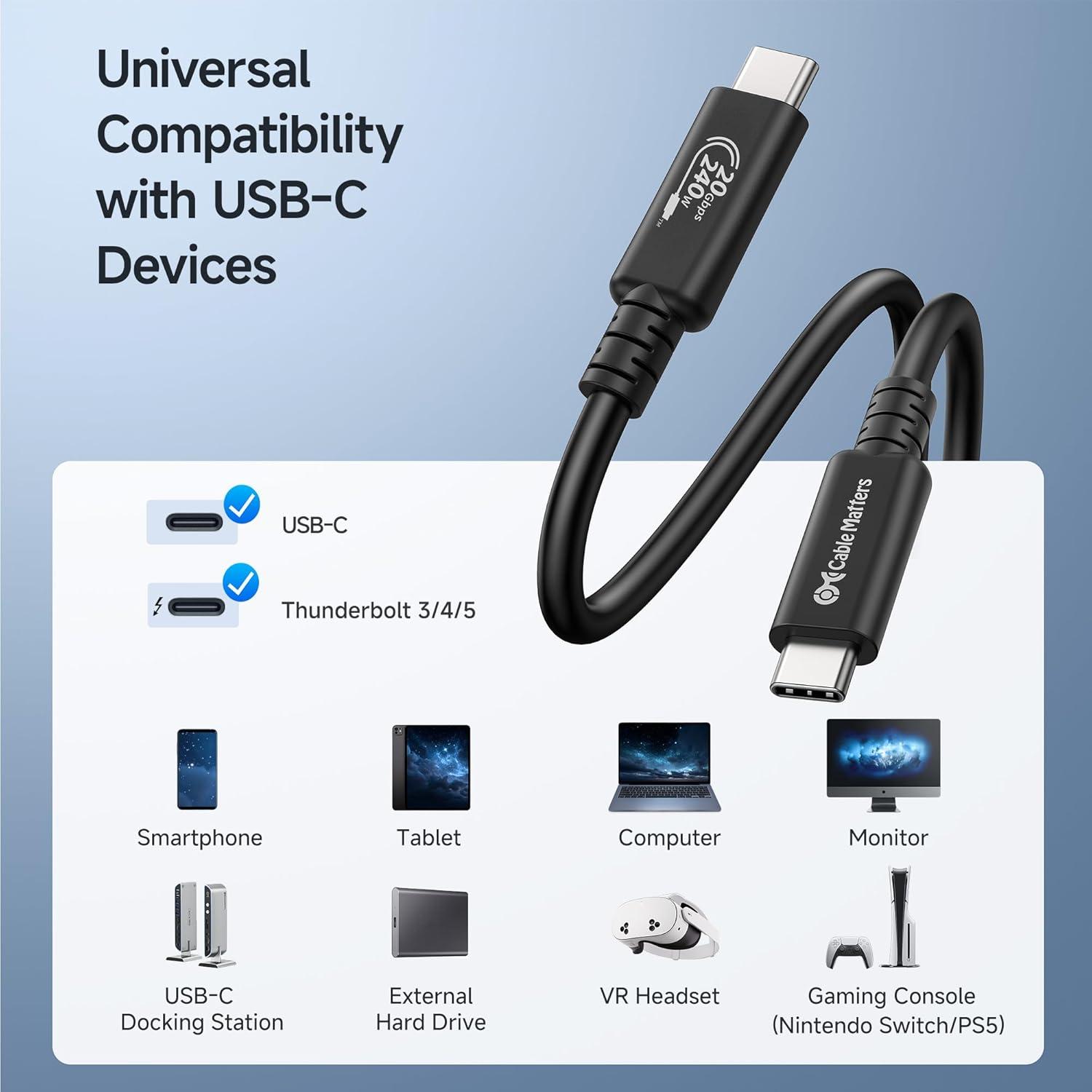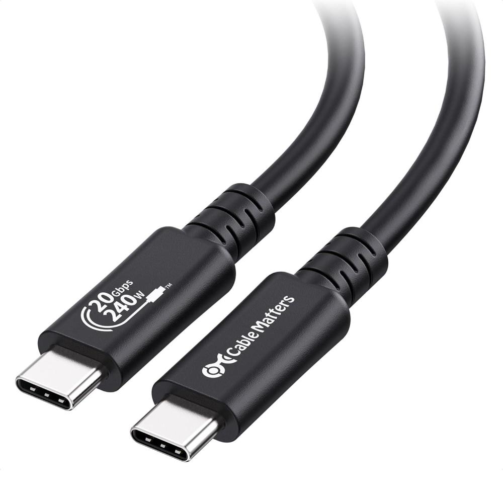 Long USB C All in One Cable: Step into the future of USB with the Cable Matters USB4 to USB4 Cable; USB Type C to USB Type C cable supports the latest USB4 standard for up to 20Gbps of bandwidth, 8K video support, and 240W charging; This USB C to C Cable supports USB PD 3.1 Extended Power Range (EPR) including 28V/140W, 36V/180W and 48V/240W; Fully compatible with devices featuring a USB-C or Thunderbolt 4 port.