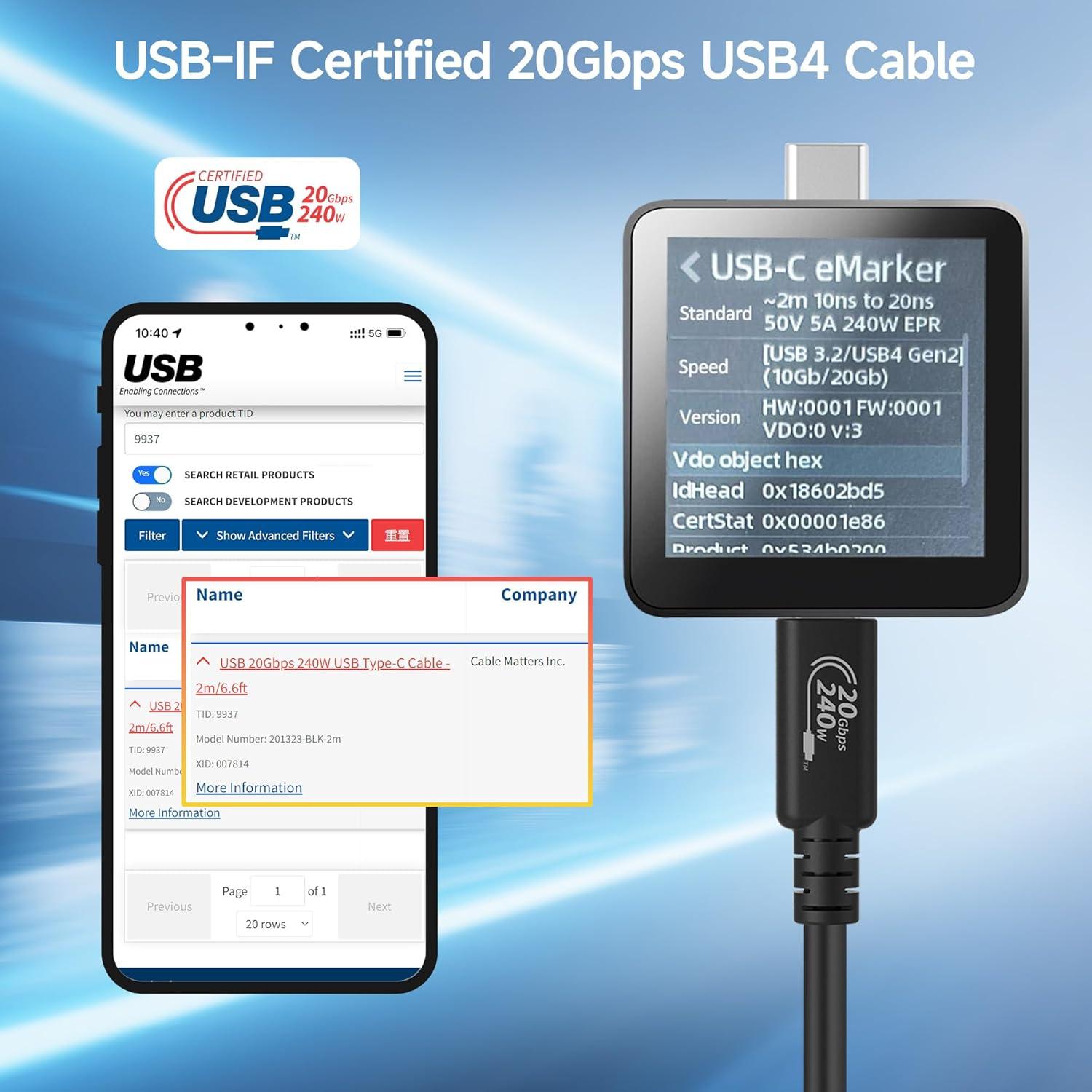 Cable Matters [USB-IF Certified] 20Gbps USB 4 Cable - 6.6ft, Supports Up to [8K@30Hz / 4K@120Hz Video, 240W Charging, 20Gbps Data Transfer] USB4 Cable Compatible with Thunderbolt 4, MacBook, XPS(6.6 Feet)